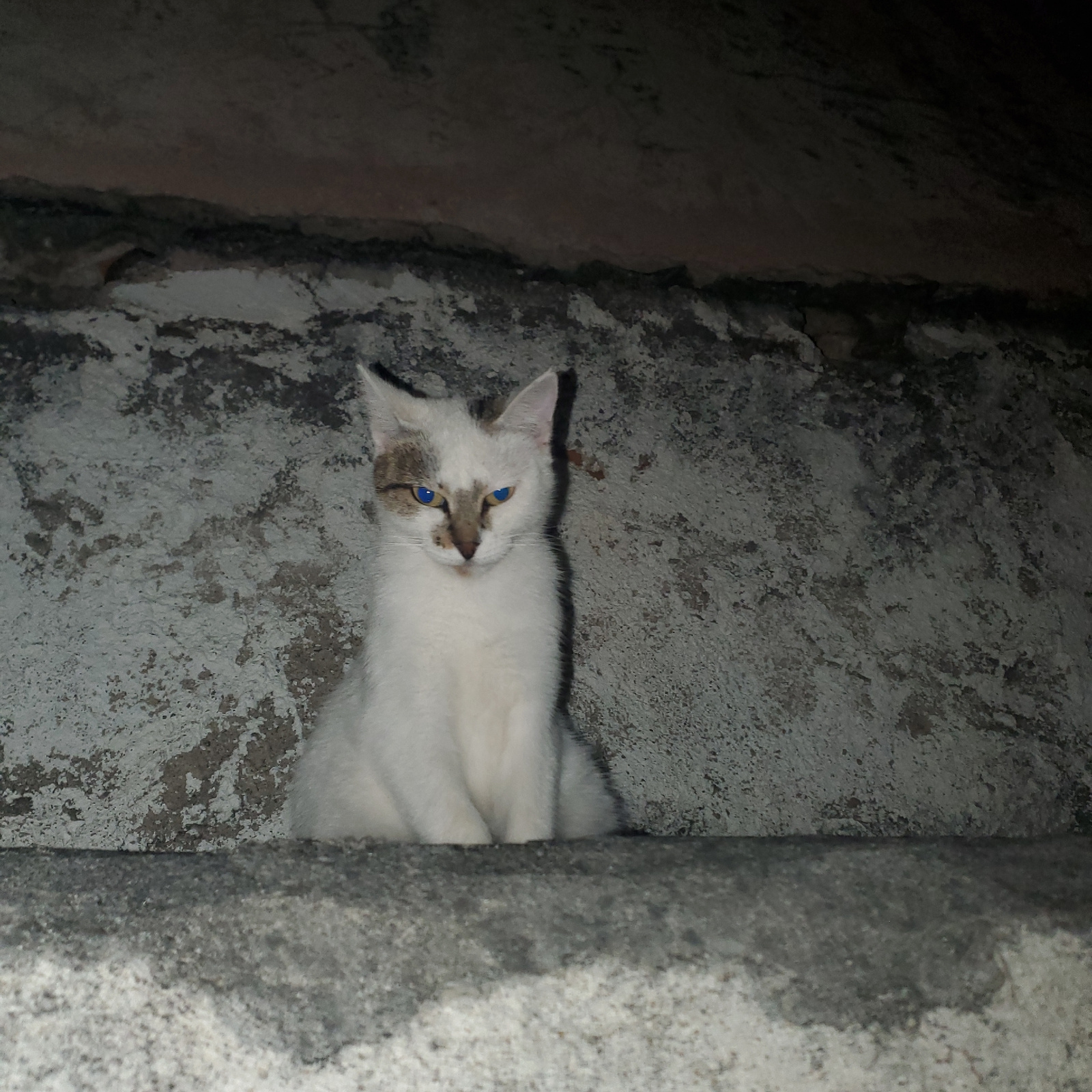 A white cat with blue eyes and tabby markings on its head is lying in a narrow space between concrete walls. The cat is facing the viewer. The walls are rough and textured. The lighting is dim. The lo…read more