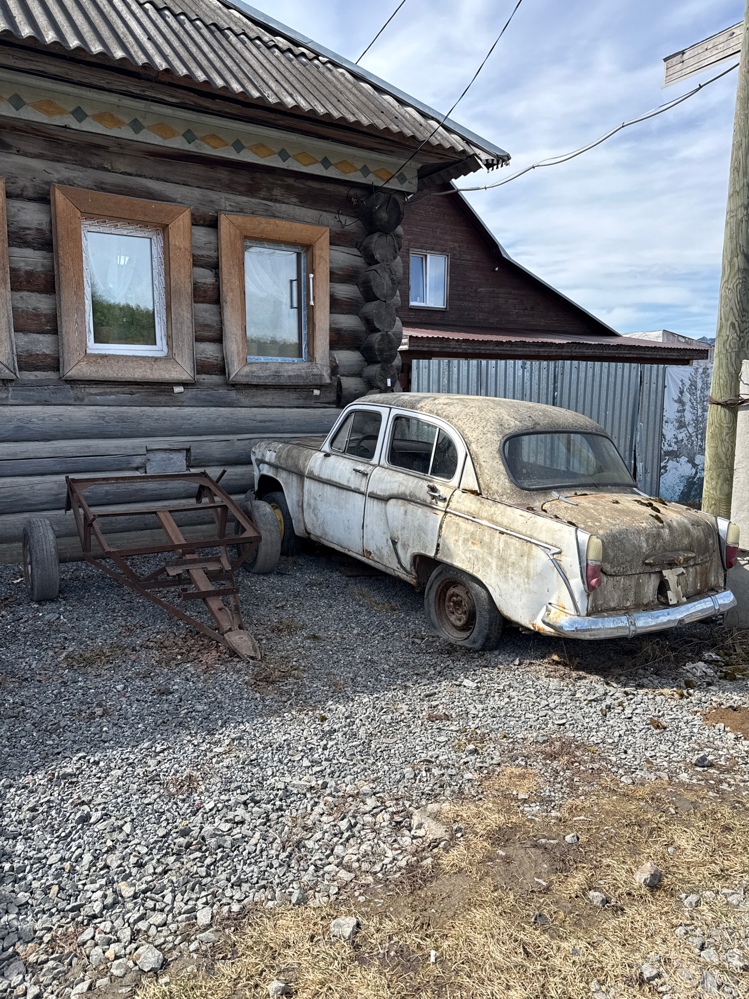 The scene depicts a dilapidated white car, likely a vintage model, parked next to a traditional wooden log cabin structure in Tyulyuk, Russia. The car is heavily weathered and appears abandoned. The c…read more
