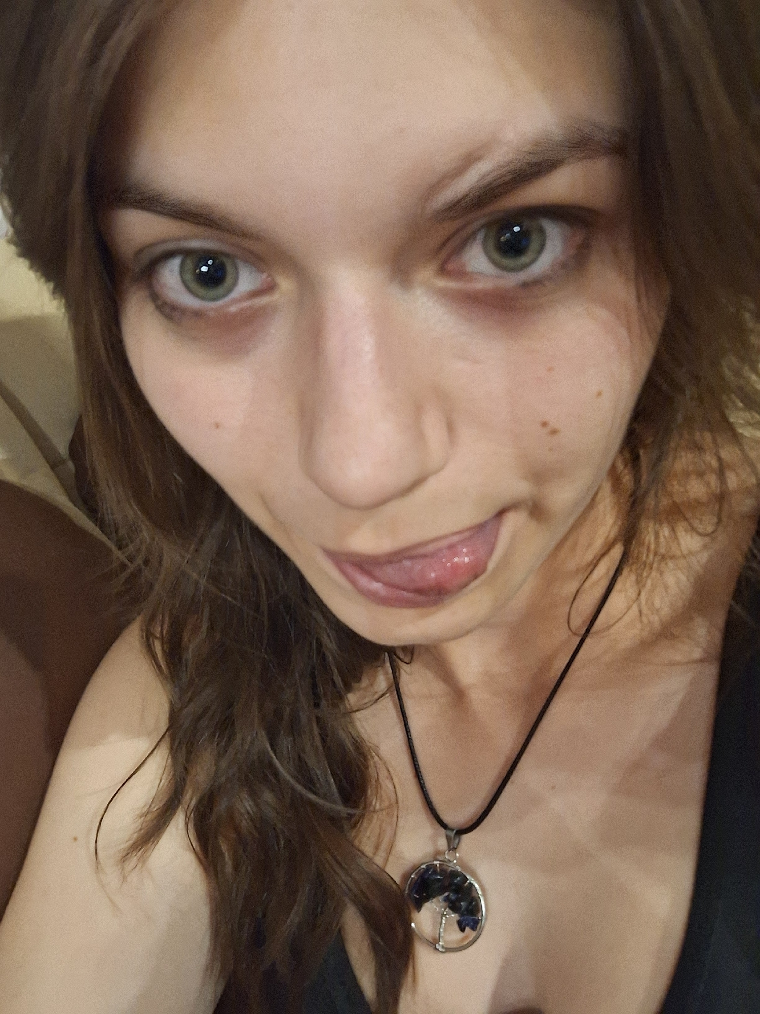 A selfie of a fair-skinned person with light brown hair and green eyes sticking out their tongue. The person is wearing a black cord necklace with a circular pendant filled with dark blue and clear st…read more