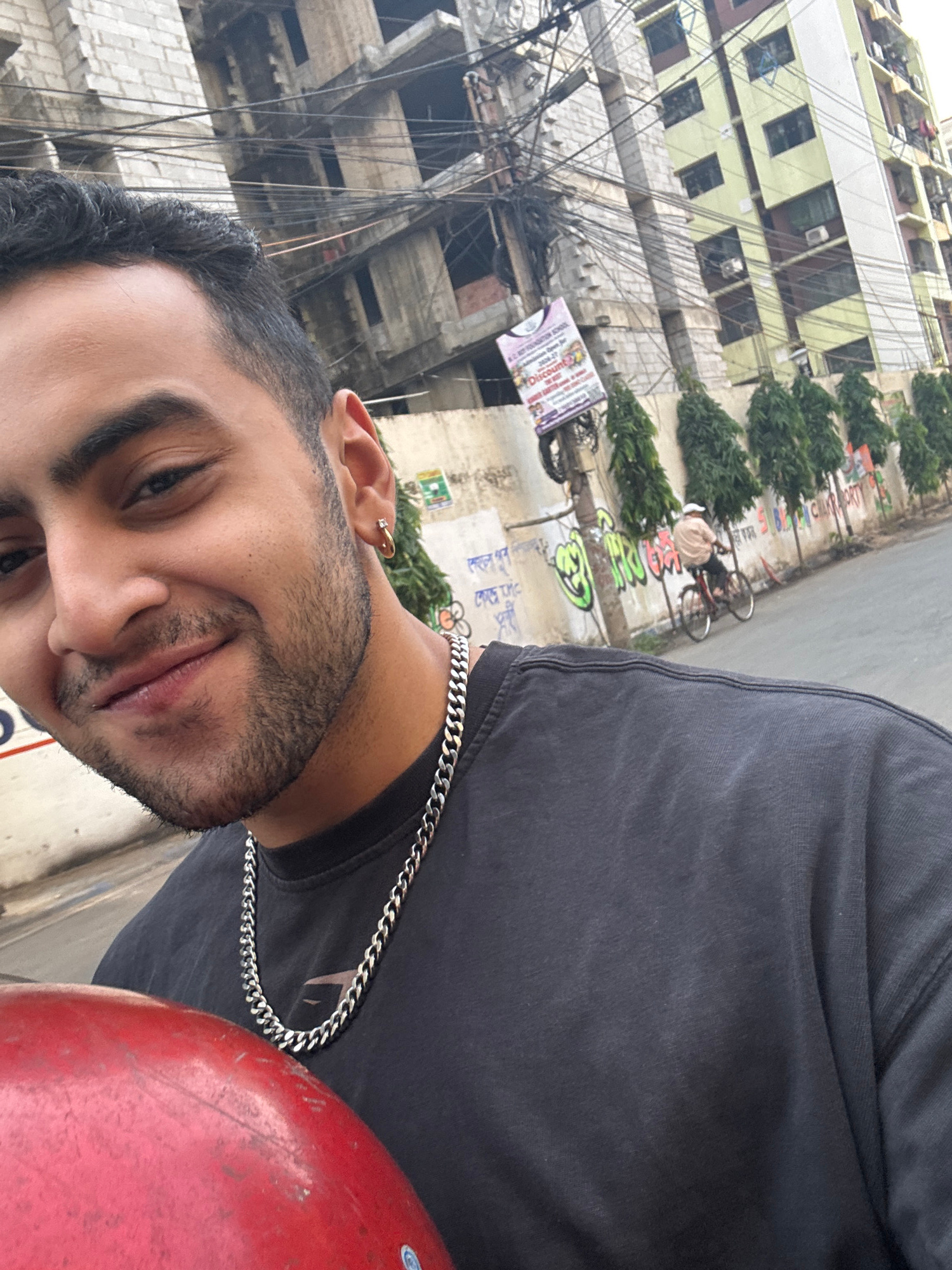 A medium close-up shot captures a man wearing a black shirt and a silver chain, standing on a street in Kolkata, India. The environment is characterized by buildings, overhead electrical wires, and tr…read more