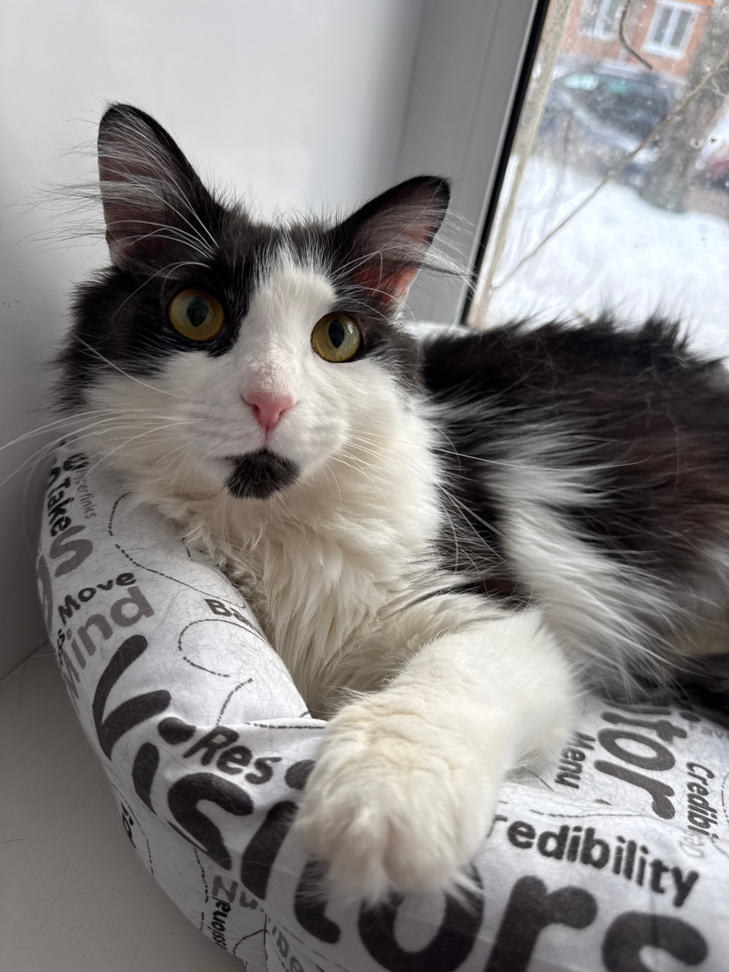 A black and white cat with green eyes lies in a rounded, patterned cat bed. The cat's head is tilted to the left. The bed is white with black printed words and phrases. A window is visible in the back…read more