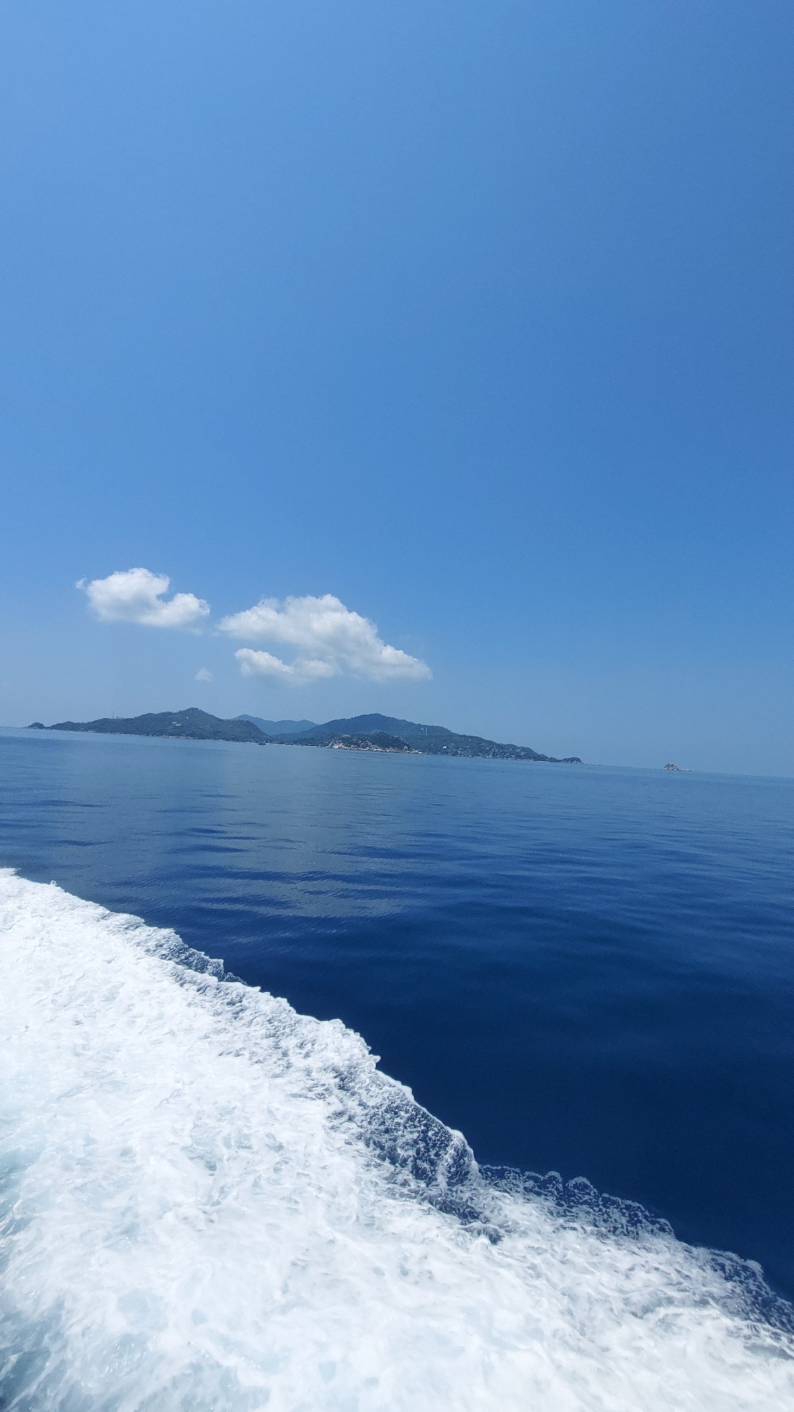 The image shows a body of water, most likely the ocean, with white water churning at the edge of the frame, likely from a boat moving through the water. In the distance, there is a coastline with moun…read more