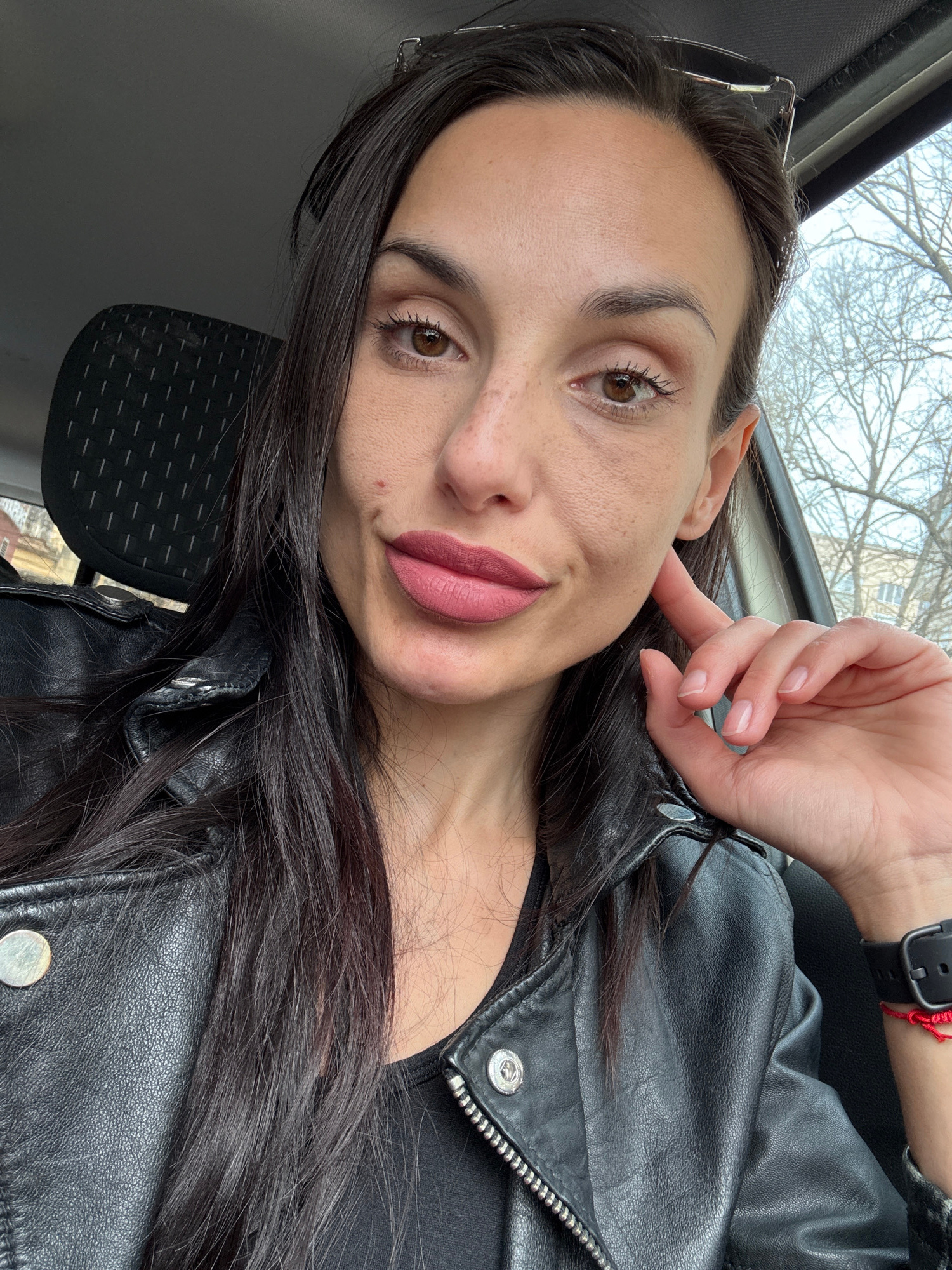 A woman with dark hair and brown eyes is shown in a close-up, angled selfie. She wears a black leather jacket and a black wristwatch with a red bracelet on her left wrist. Her hand is near her face, t…read more