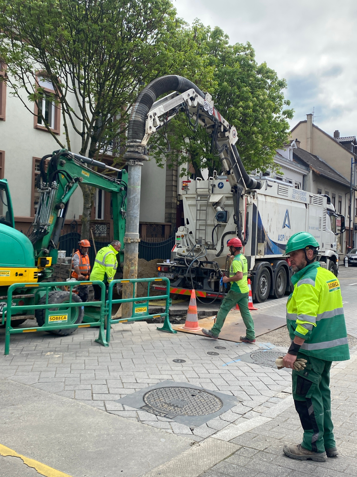 In Bischheim, France, a team of construction workers are conducting underground maintenance. A large white vacuum truck with "SOBECA" branding is parked next to the excavation site. One worker in a gr…read more