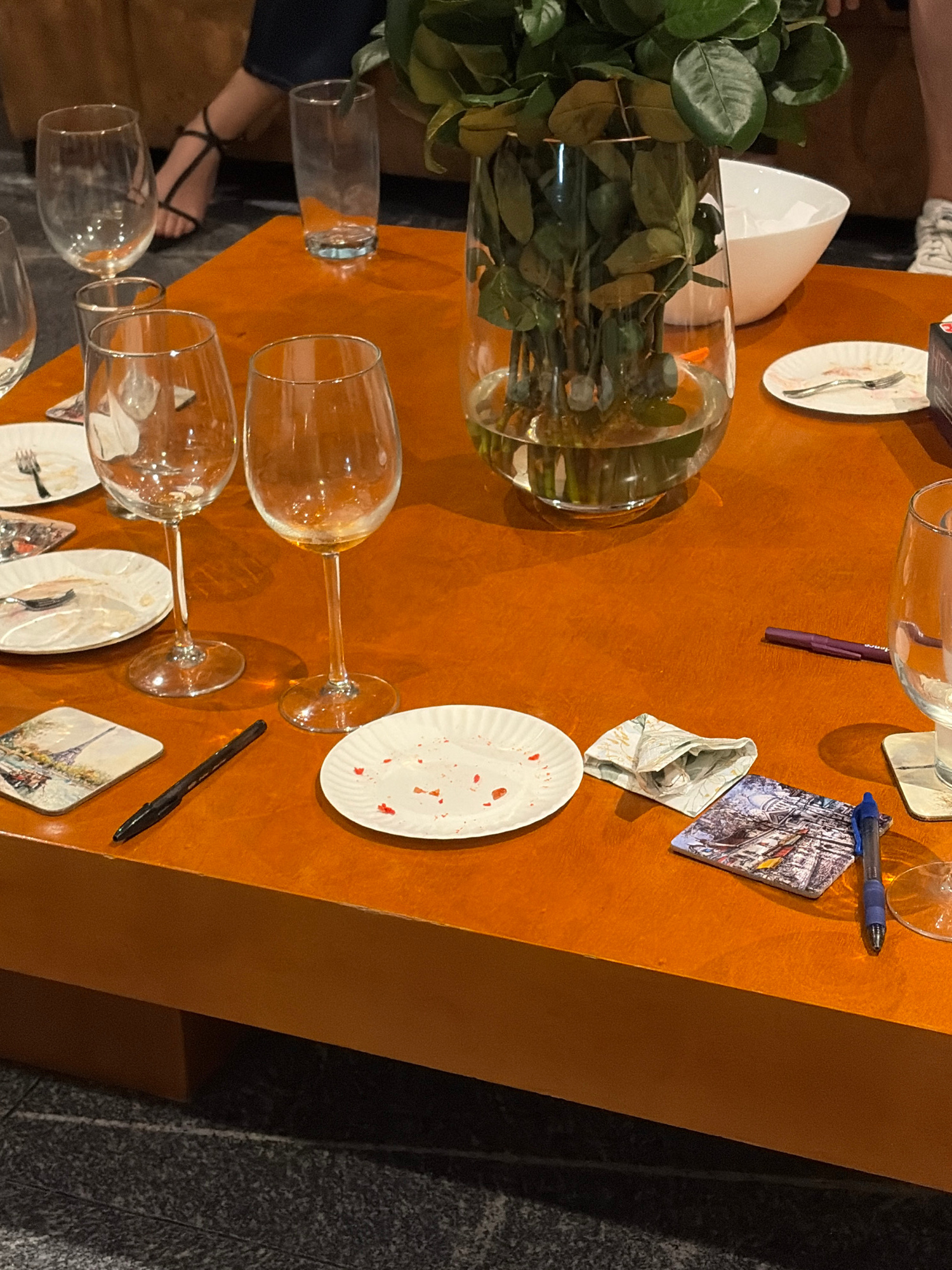 The scene depicts a cluttered wooden table, possibly in a restaurant or event space. There are several wine glasses, some empty and some appearing to be used. Disposable white plates, some with food r…read more