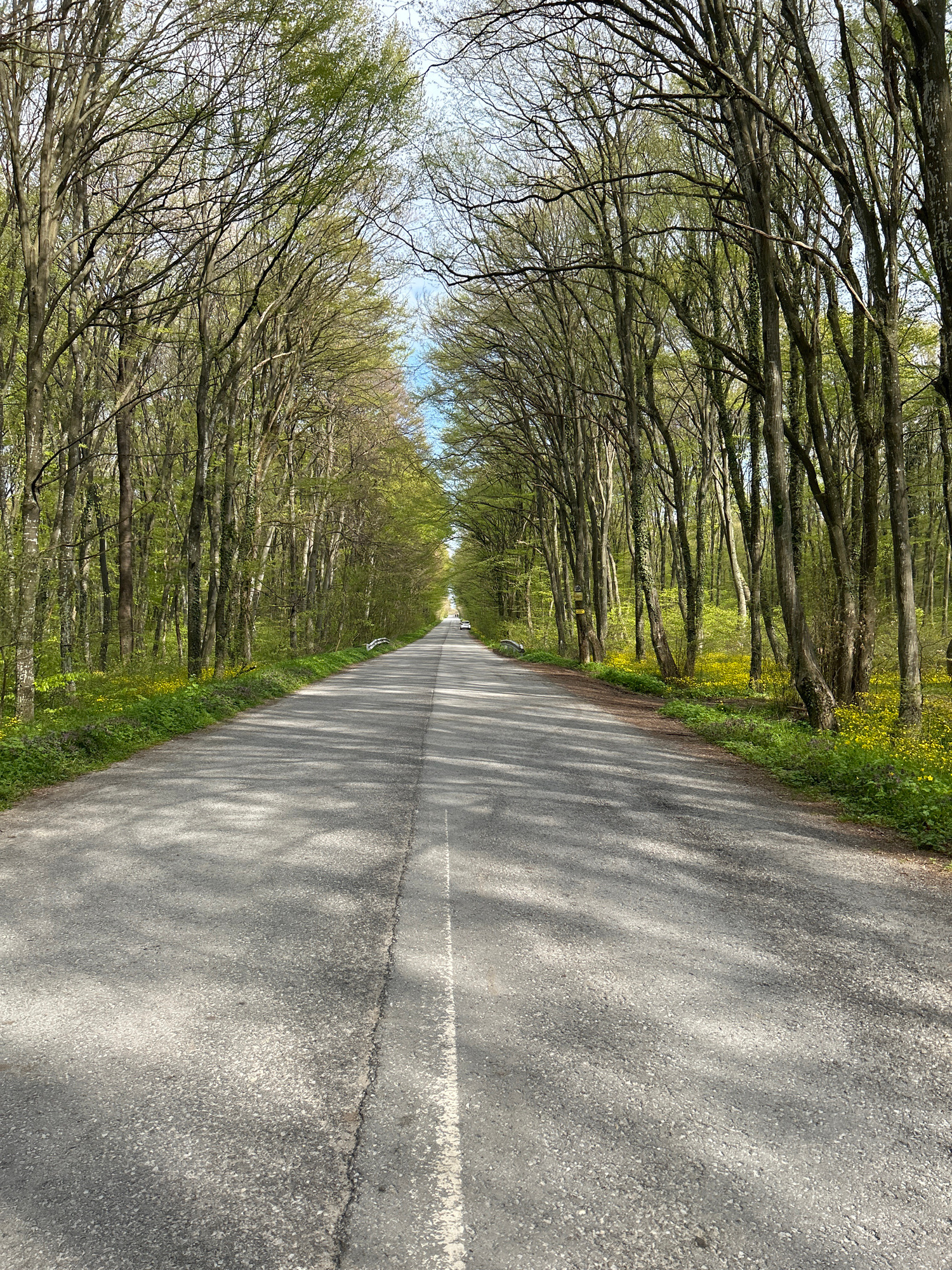 A long, straight asphalt road stretches into the distance, lined on both sides by tall trees forming a natural canopy overhead. The image is taken from a slightly low perspective, looking down the roa…read more