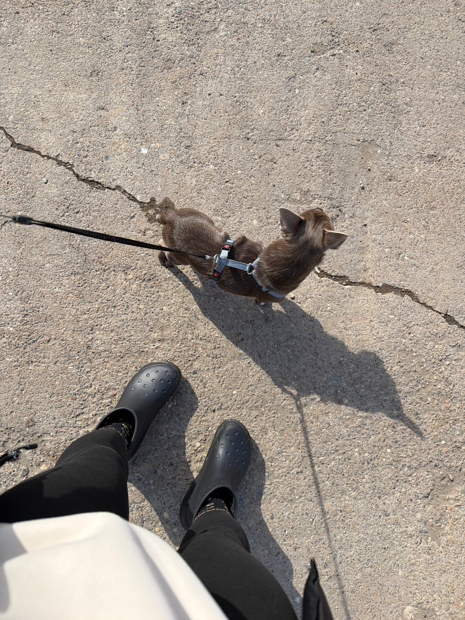A small, gray-brown Chihuahua wearing a gray harness and black leash stands on cracked concrete. The dog is positioned to the left of the frame, facing away from the viewer. To the right, a person's l…read more