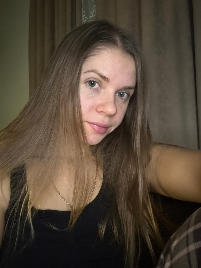 A woman with long, light brown hair partially covers her face in this selfie. Her blue eyes are prominent, and she has fair skin. She wears a black top and a delicate gold necklace. A textured curtain…read more