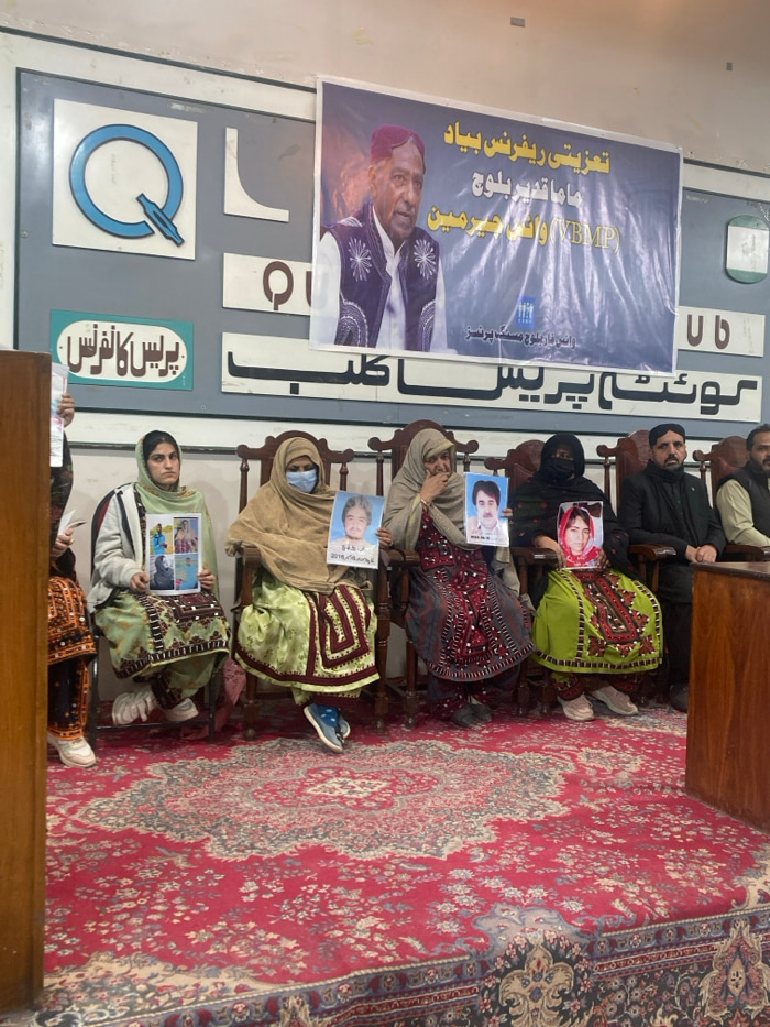 An indoor scene within the Quetta Press Club, located in Quetta City Tehsil, Pakistan, depicts a press conference or gathering. Eight individuals are visible, primarily seated on ornate wooden chairs…read more