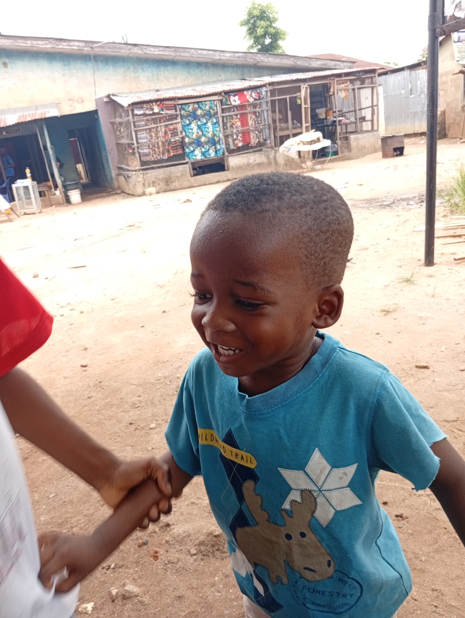 This outdoor photograph captures a joyous moment featuring a young child, likely a boy, in what appears to be a street market or community area in Owerri, Nigeria. The child, positioned on the right s…read more