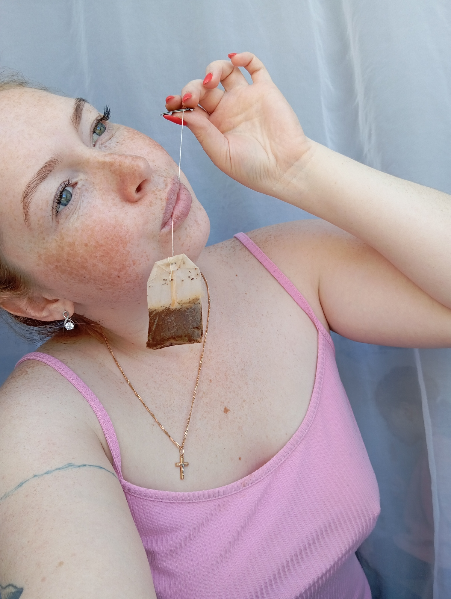 A woman lies on a white surface, wearing a pink tank top. She has fair skin with freckles, and red nail polish on her fingernails. A used tea bag is suspended from her mouth by the string. A thin gold…read more