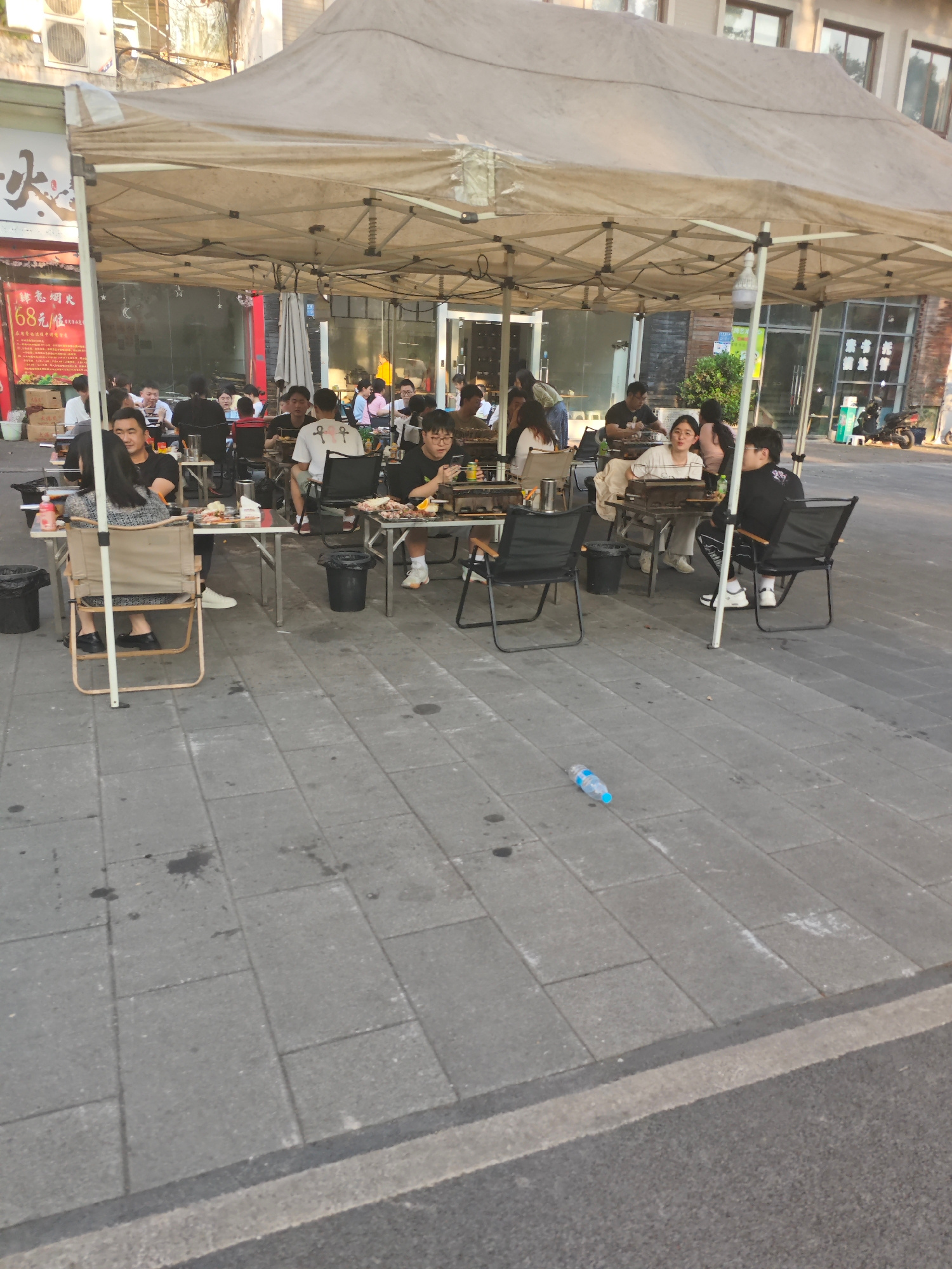 The image depicts an outdoor dining area in Chongqing High-tech Zone, China. A large, open-sided tent structure provides shade for multiple tables where people are seated and eating. People are intera…read more