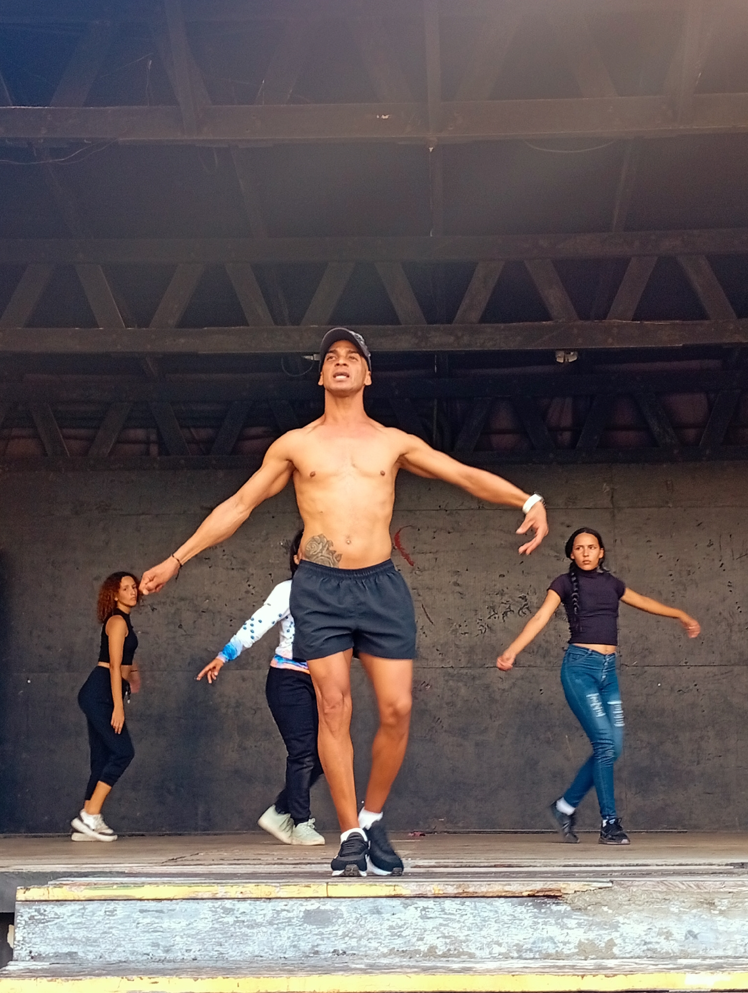 On a stage in Playa El Agua, Venezuela, a shirtless man in a baseball cap, black shorts, and black-and-white sneakers stands with his arms outstretched. He has a tattoo on his left abdomen. Three wome…read more