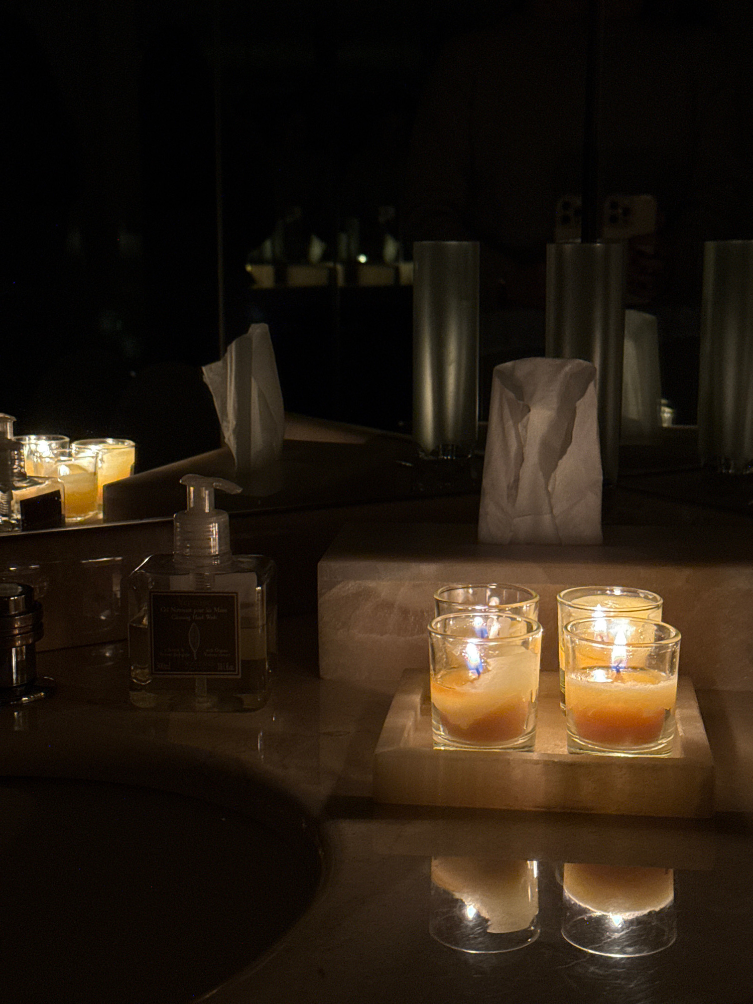 Two lit candles in glass containers sit on a marble stand to the right of the image. To the left of the candles are white paper towels. Below the towels is a clear soap dispenser. A black sink is visi…read more
