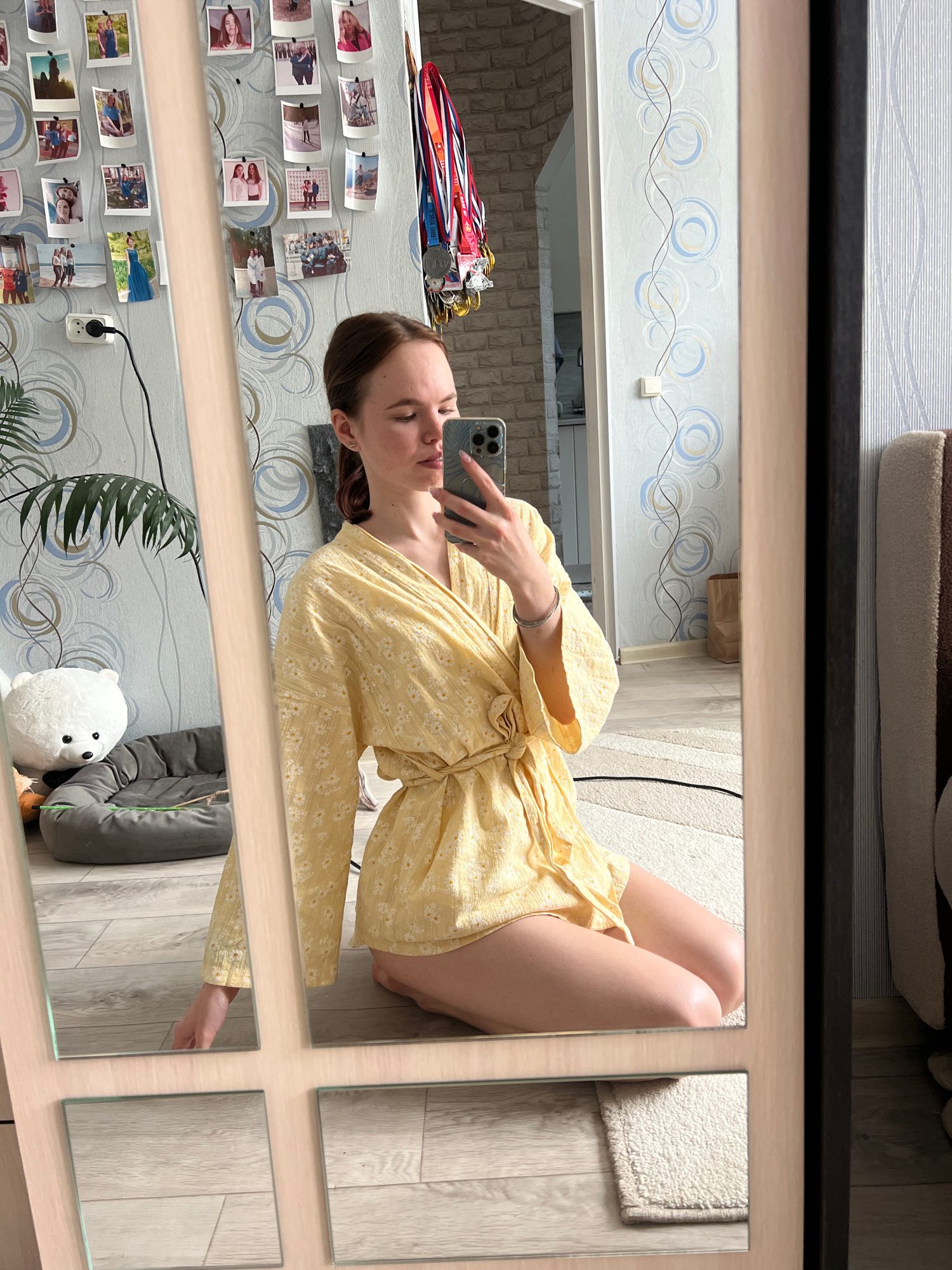 A young woman is seen in a mirror selfie. She is wearing a yellow, floral-patterned robe and holding a smartphone in her right hand. The mirror reflects a room with a wall adorned with photographs, an…read more