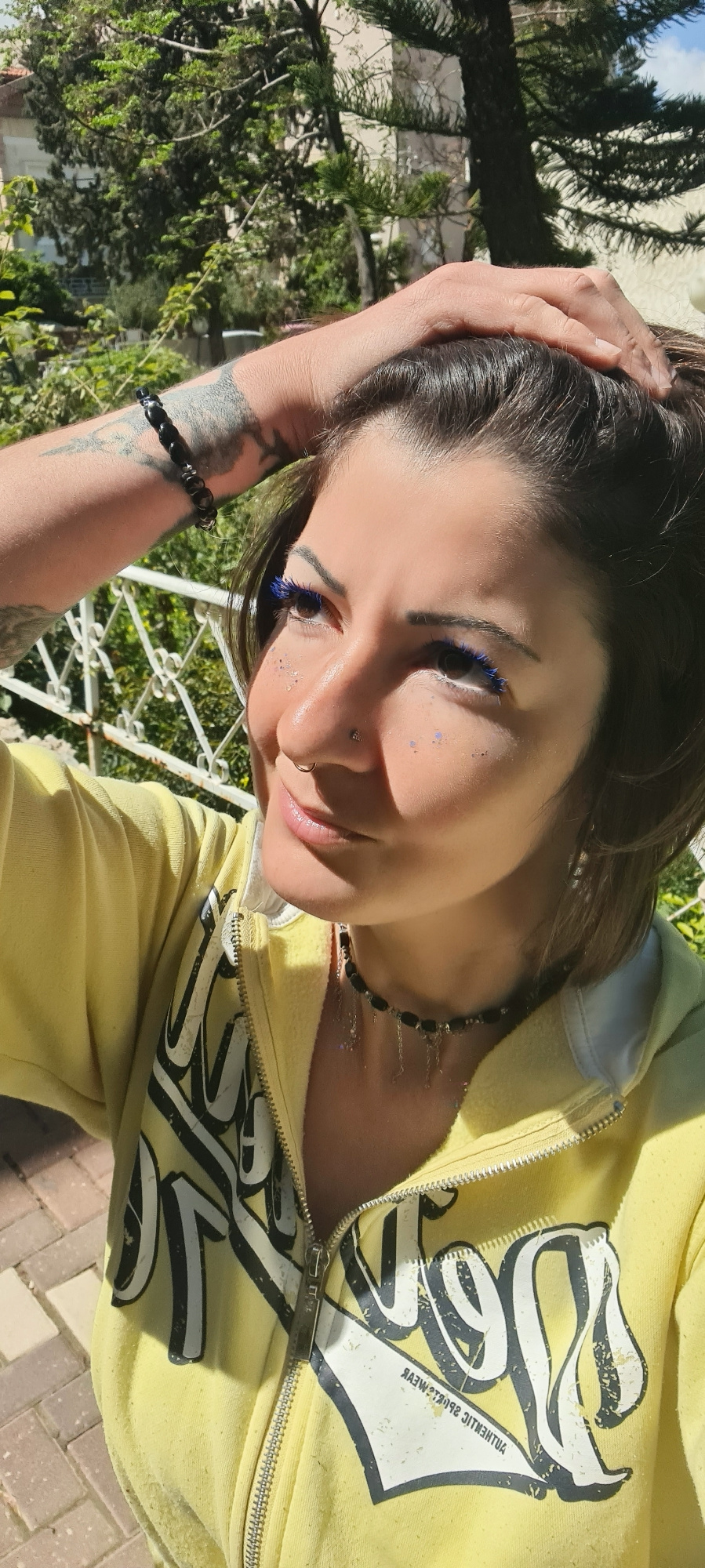 A woman with blue eyelashes and facial glitter poses outdoors with her hand on her head. She wears a yellow zippered hoodie with black graphic text. She also has a black beaded necklace and bracelet.…read more