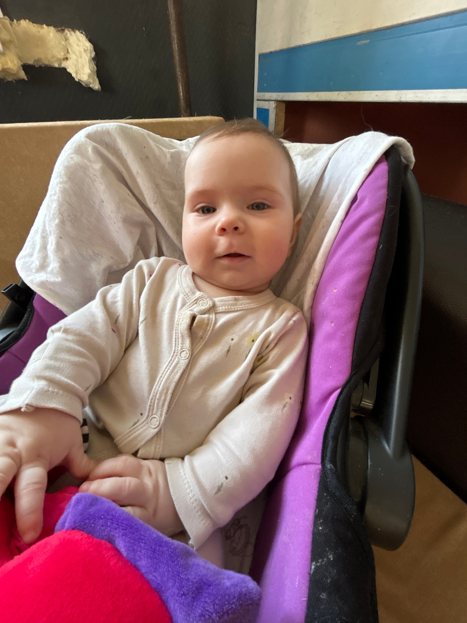A baby is lying on a white cloth, wearing a light-colored onesie. The baby is positioned diagonally in the frame, facing upwards and slightly to the left. To the baby's upper right is a purple and bla…read more