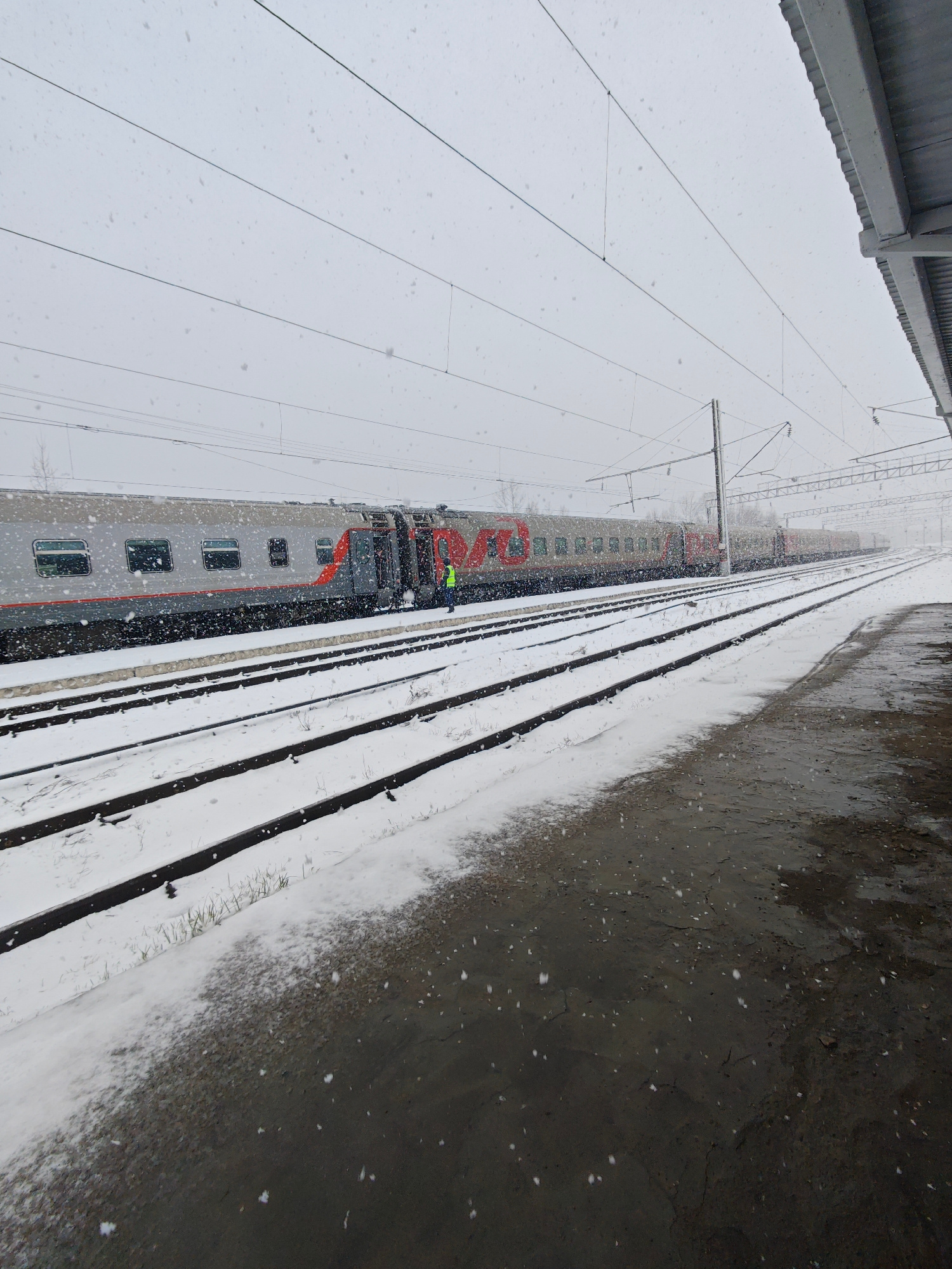 The image depicts a train at a station in Kambarka, Russia, during a snowy day. The train cars are silver with red accents and the Russian Railways logo is visible. A person in a yellow vest stands neβ¦read more