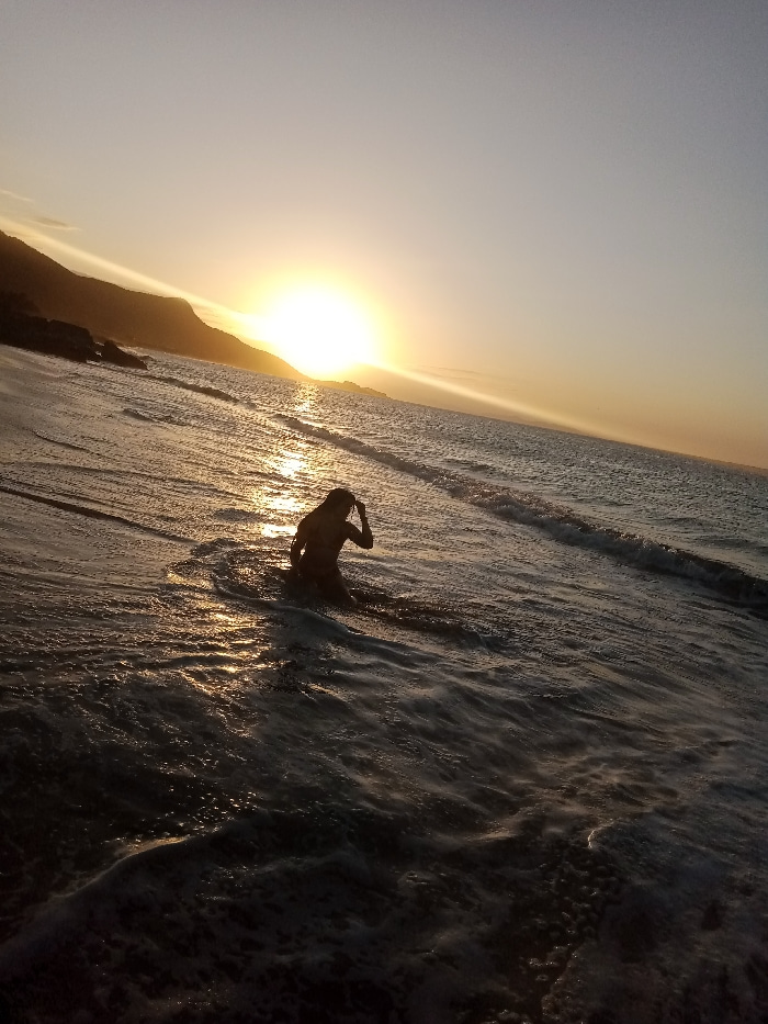 A person is silhouetted in the ocean, kneeling in the water as the sun sets behind them. The water reflects the sunlight, creating a glistening effect. Waves lap gently toward the shore, and a dark mo…read more