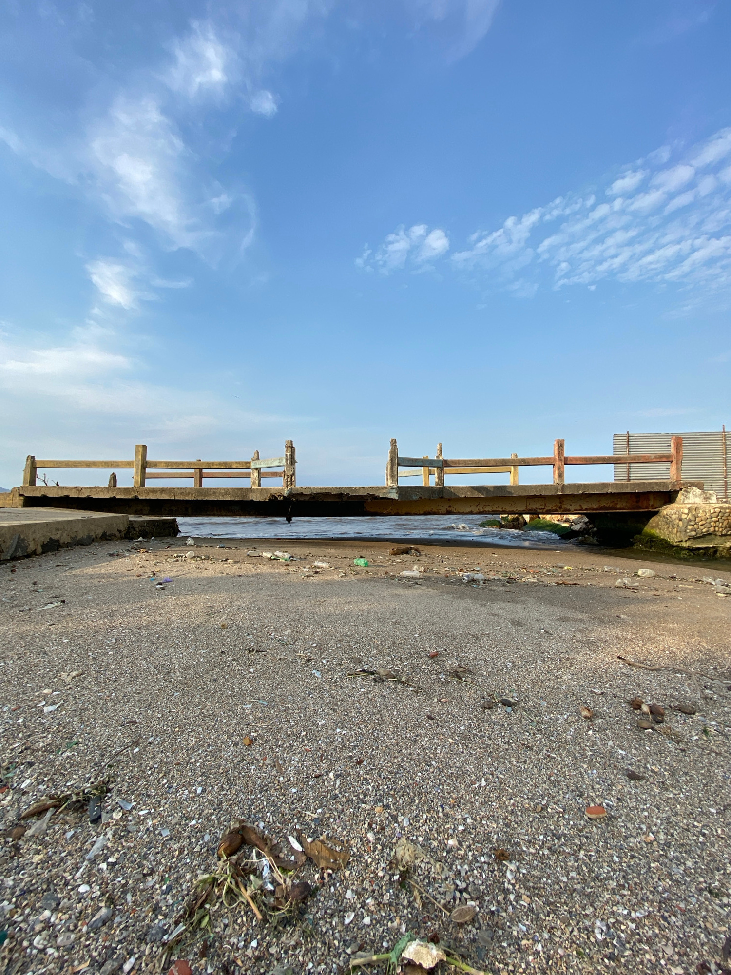 This is an eye-level, outdoor shot in Higuerote, Venezuela, depicting a waterway bordered by a concrete structure and a gravelly bank. The sky, a clear blue with sparse white clouds, occupies the left…read more
