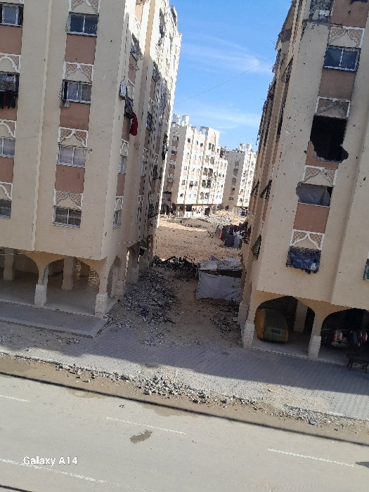 Damaged beige apartment buildings stand on either side of a street. Many windows are missing or broken. Debris litters the ground between the buildings and along the sidewalk. A blue sky is visible ab…read more
