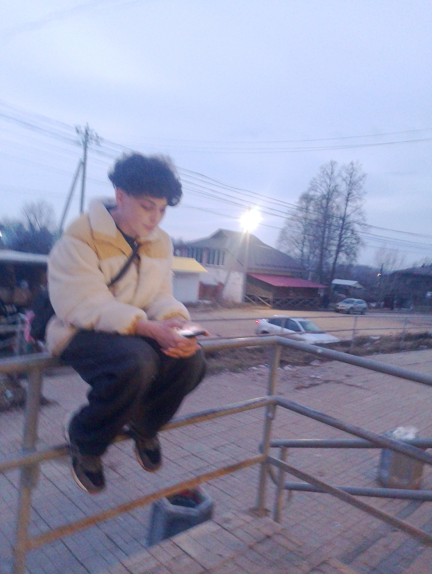 A young person with dark curly hair is perched on a metal railing, looking at a mobile phone in their hands. They are wearing a cream-colored puffer jacket, dark pants, and dark shoes. A black strap i…read more