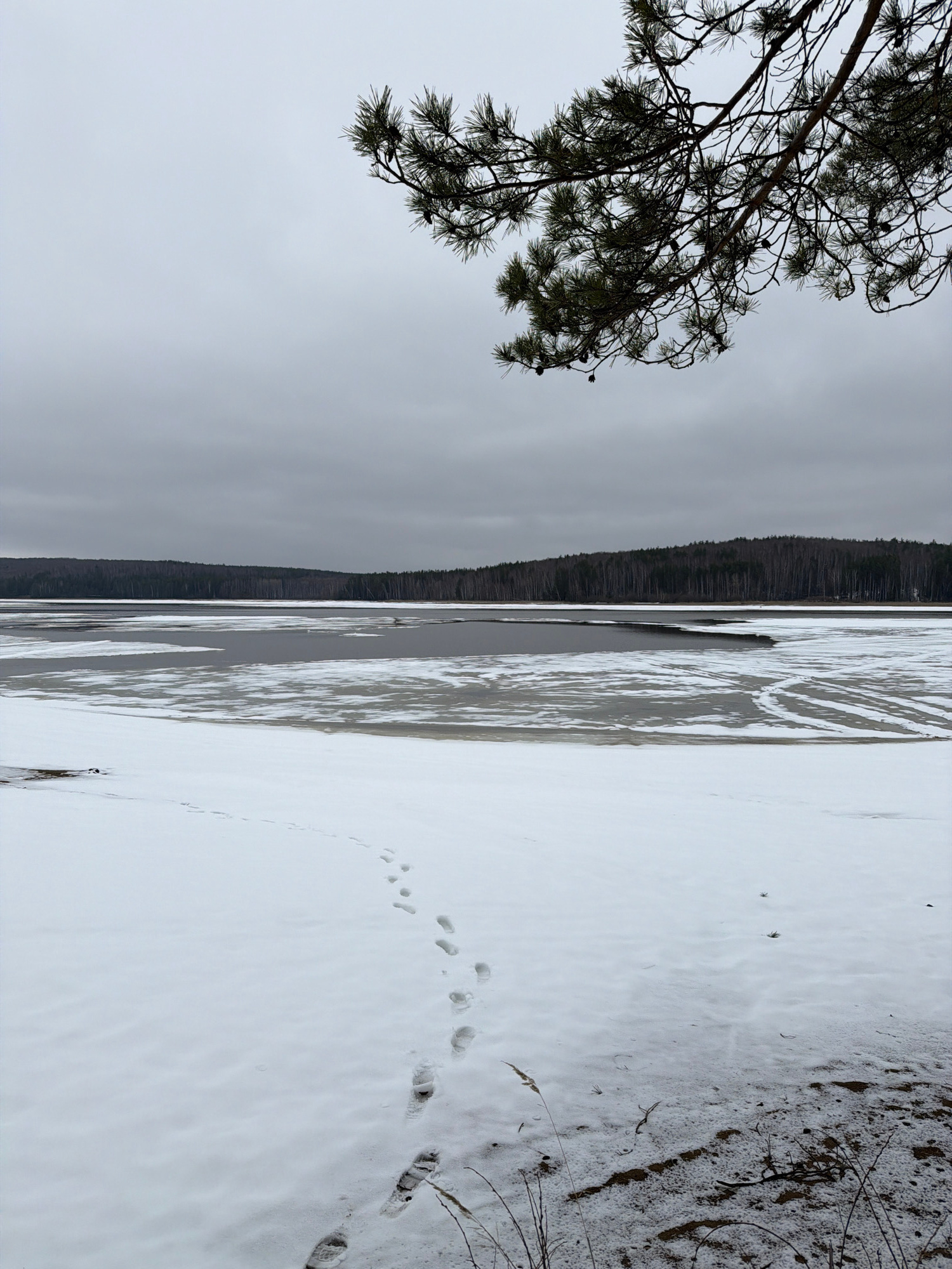 The image captures a winter landscape, likely on the shores of the Kama Reservoir in Chaykovsky, Russia. A snow-covered area, possibly a frozen lake or riverbank, dominates the foreground, marked with…read more