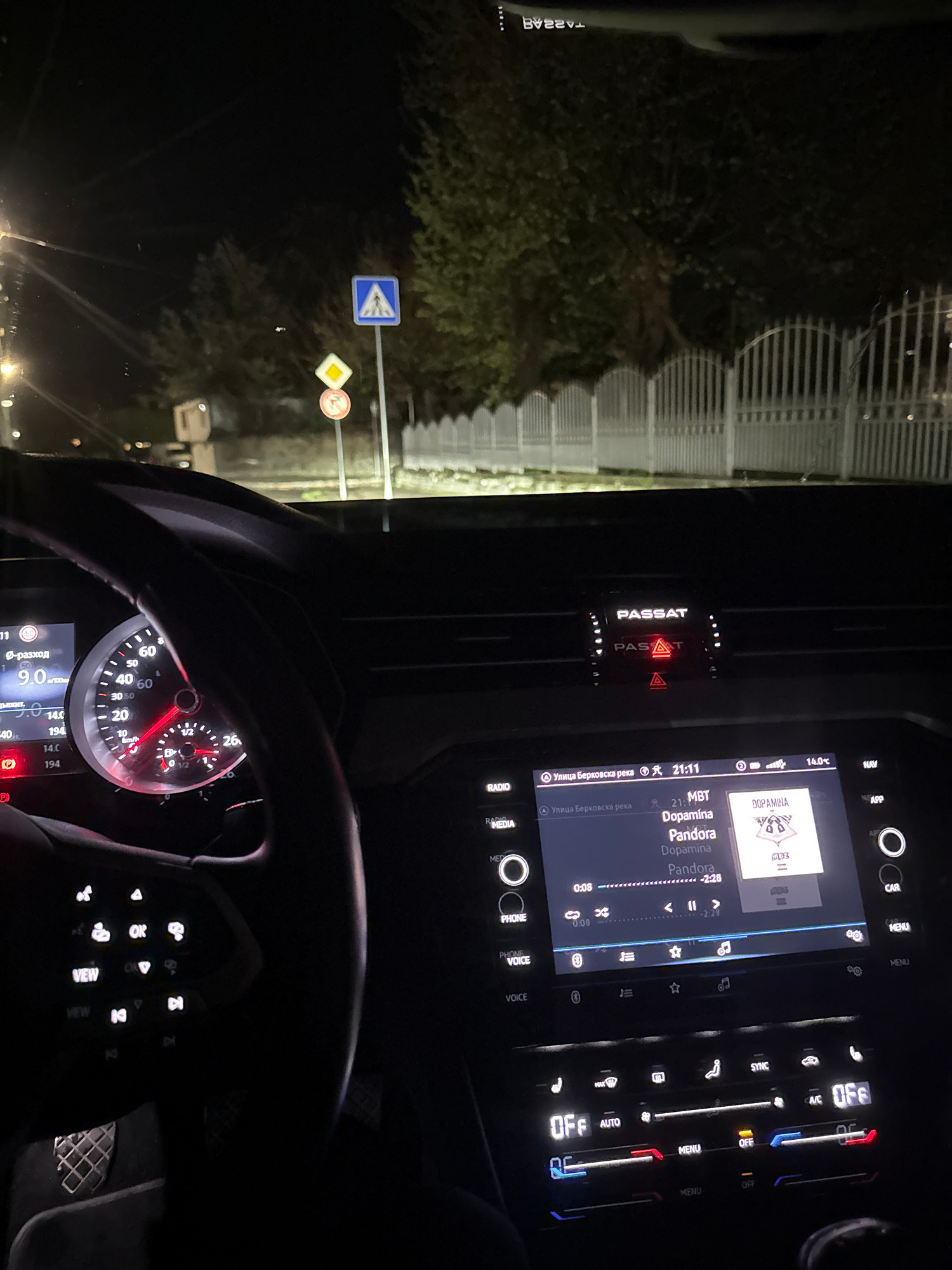 The image shows the interior of a Volkswagen Passat, likely at night. The dashboard is illuminated, displaying information on the infotainment system, which is playing "Dopamina" by Pandora. The car iā¦read more