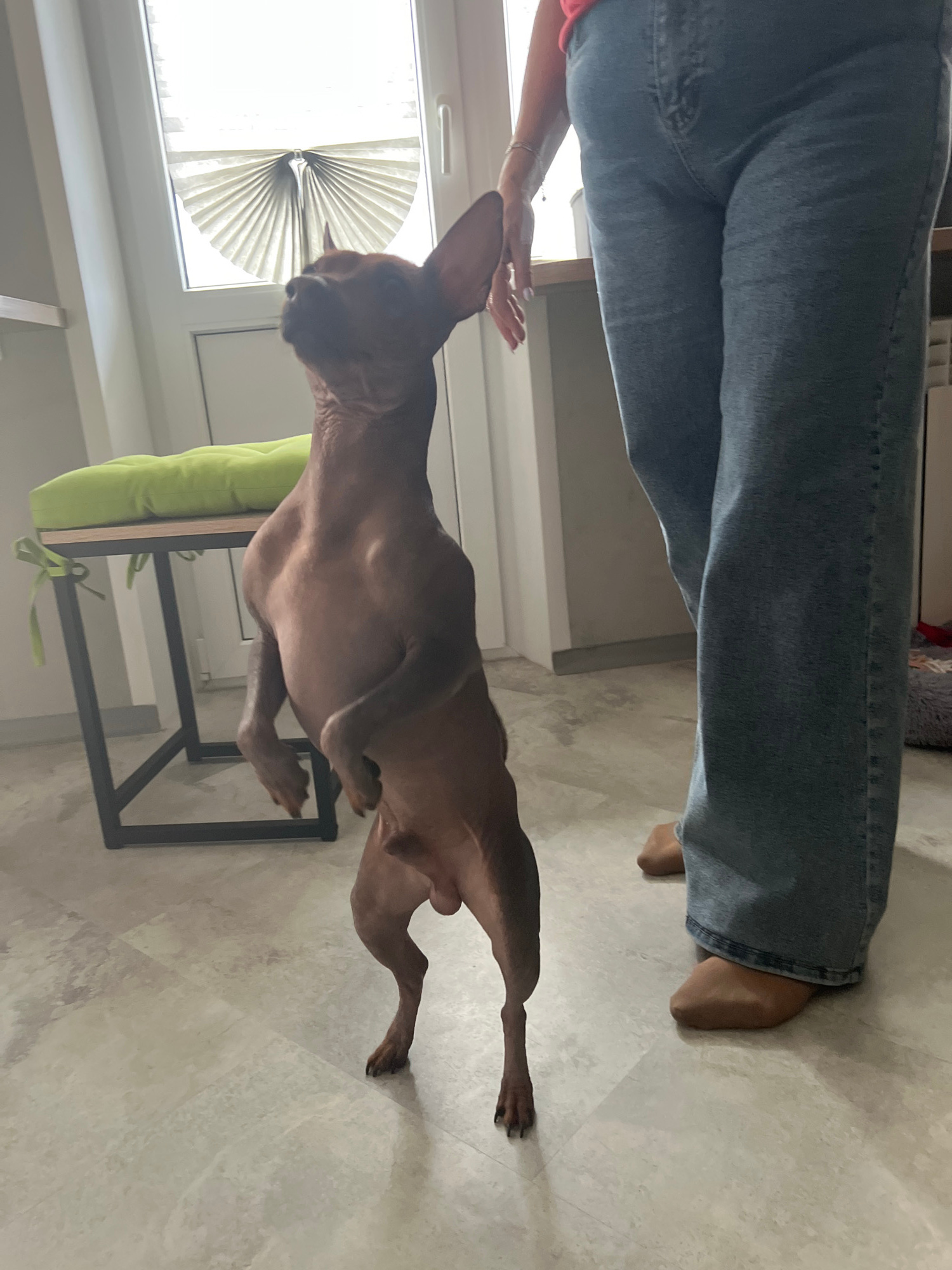 An upright, eye-level indoor shot captures a person and a hairless dog interacting. The person, positioned on the left, wears light blue jeans and is barefoot, with their left arm extending downwards,…read more