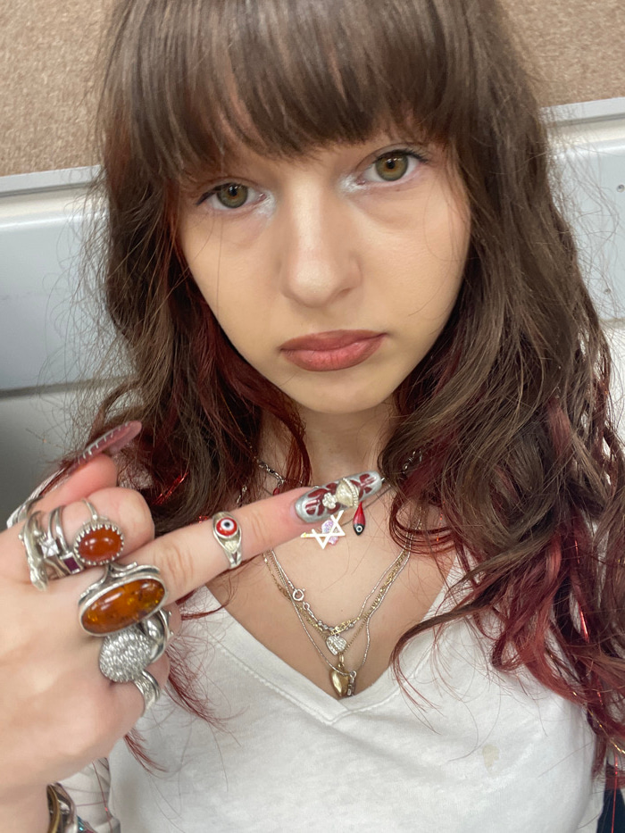 A close-up, chest-up portrait depicts an individual, likely female, with shoulder-length brown hair highlighted with reddish strands and straight bangs. Their eyes are light brown/hazel, accentuated b…read more