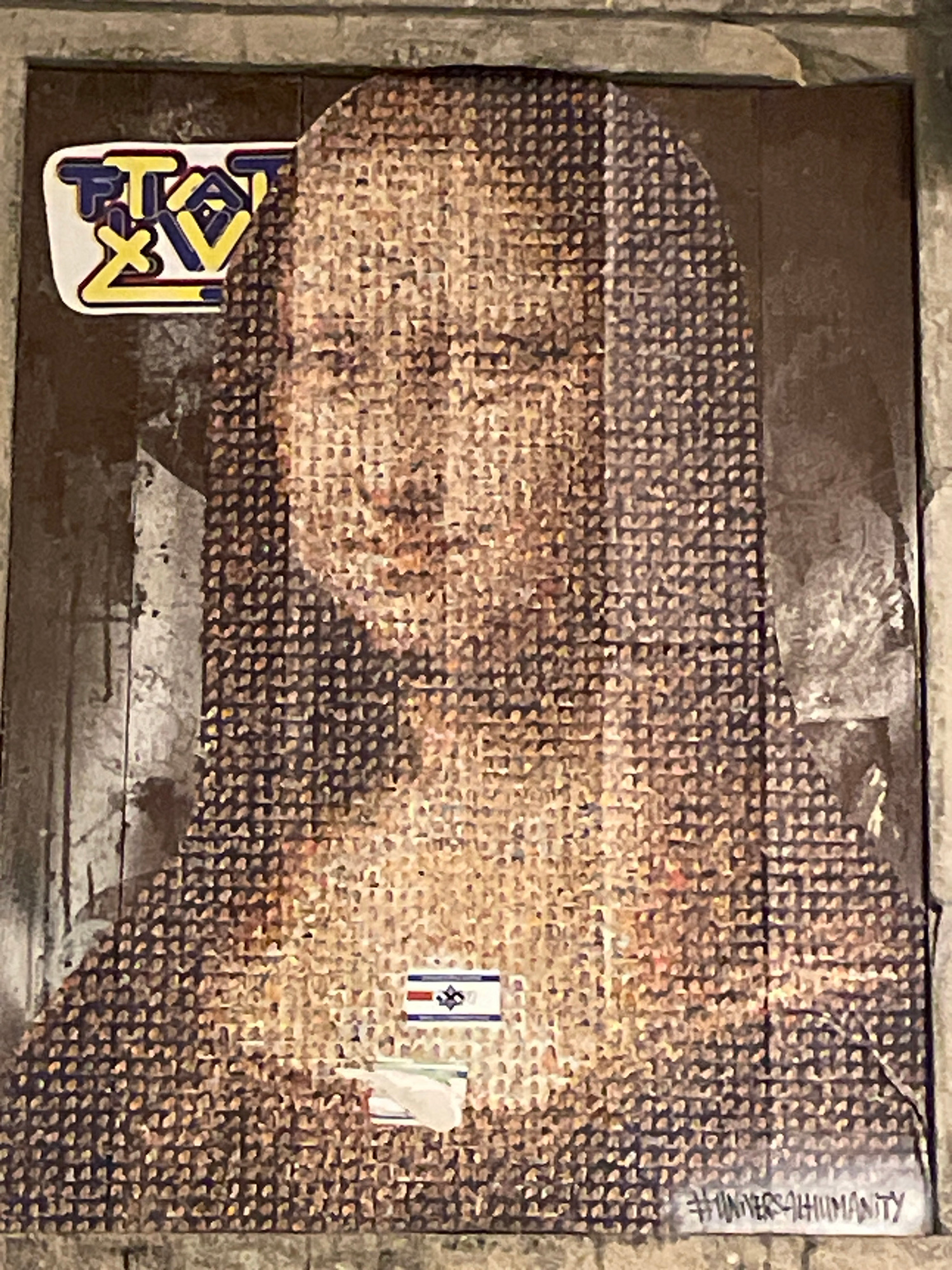 The image features a large, rectangular poster or sticker, showing signs of wear and adhesion, affixed to a dark, possibly metallic or painted wooden surface in an urban setting. The primary visual on…read more
