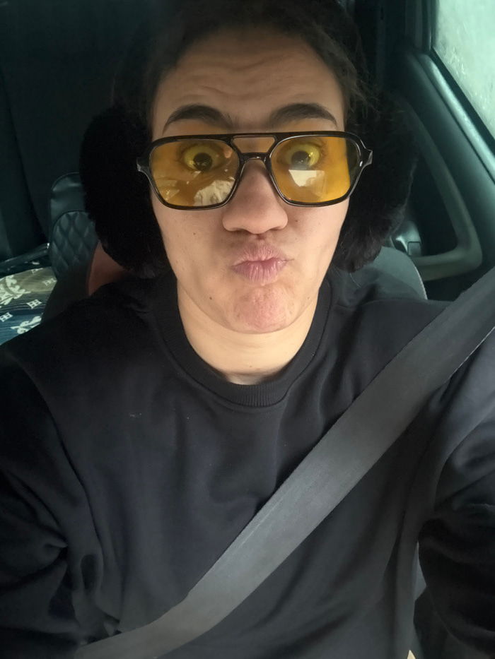 A person with fair skin and dark hair, wearing black earmuffs and yellow-tinted glasses, puckers their lips for a selfie. They are positioned in a car, with a gray seatbelt diagonally across their bla…read more