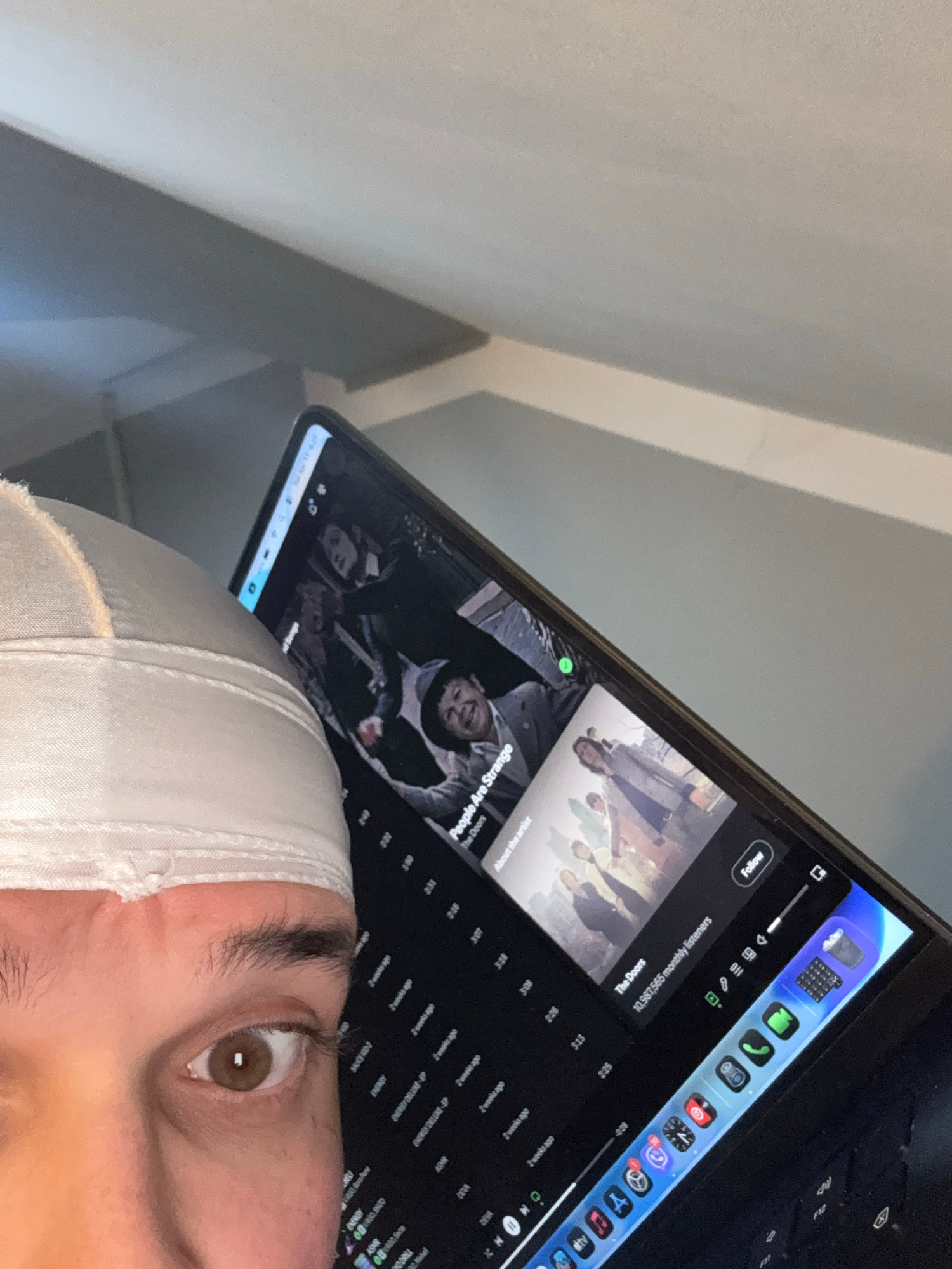 The image depicts a close-up view of a person's face, specifically their eye and forehead, with a white fabric covering part of their head. A laptop screen is positioned above the person's face, displ…read more