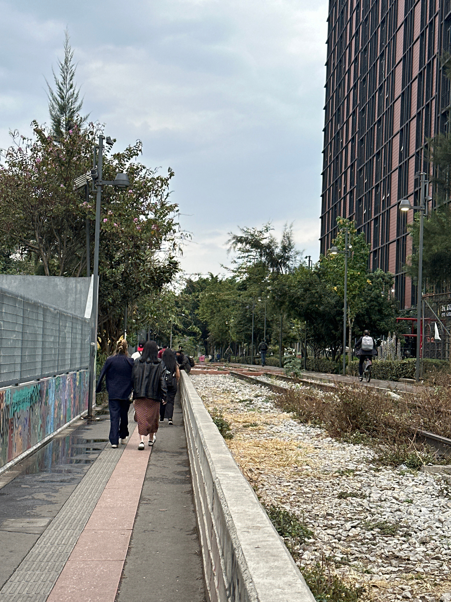 The image depicts a sidewalk in Mexico City, Mexico, adjacent to a building with a dark, grid-like facade. Several people are walking along the sidewalk, heading away from the viewer. To the right of…read more