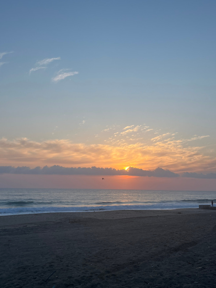 This image captures a sunrise or sunset over a beach in Alanya, Turkey. The upper sky is light blue with sparse, wispy white clouds. Below this, a broad band of cumulus-like clouds stretches horizonta…read more