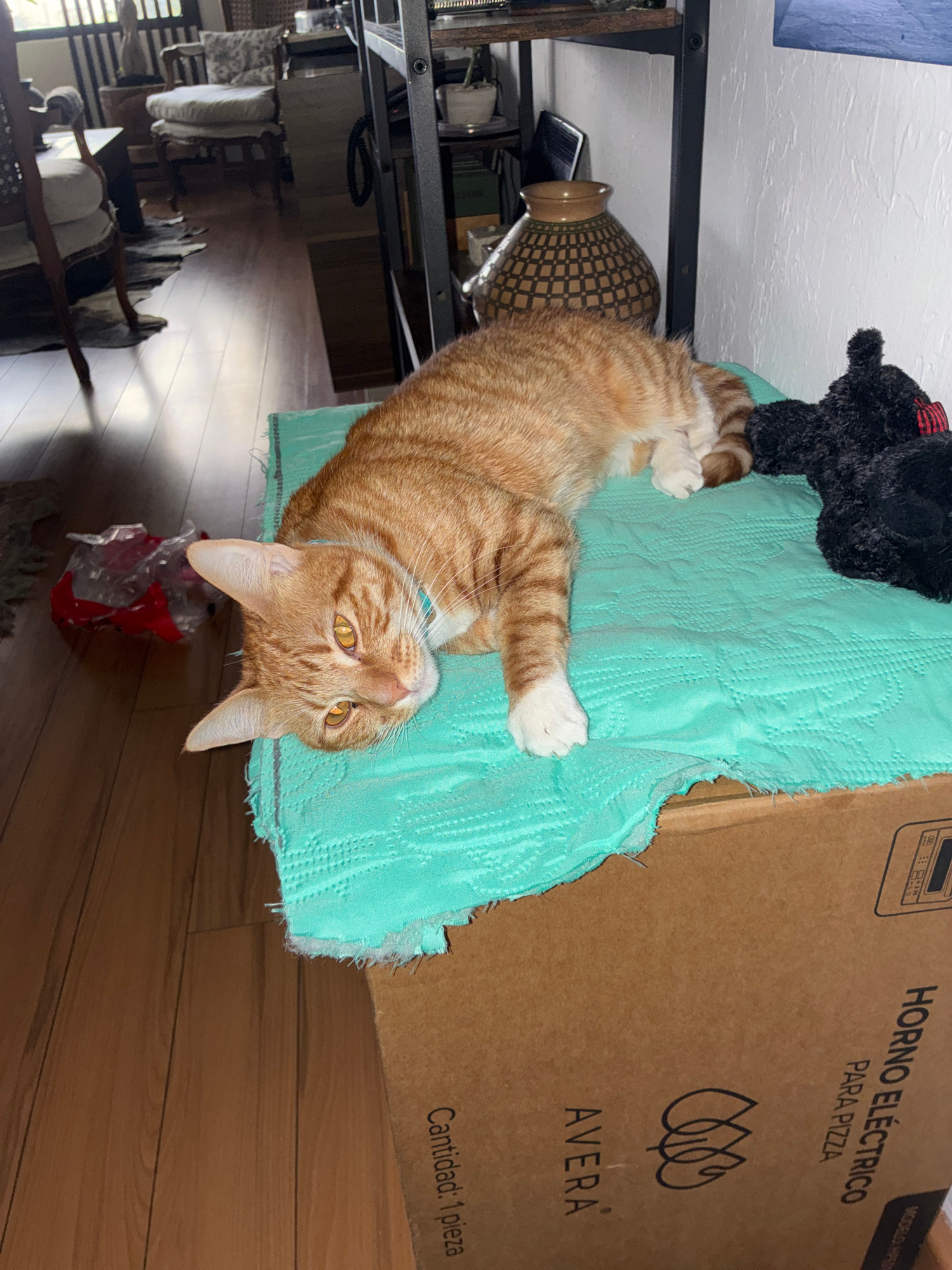 A tabby cat lies on a blue quilted pad. A black stuffed animal rests on the pad near the cat. A brown cardboard box with the words "HORNO ELECTRICO PARA PIZZA" and "AVERA" printed on it sits next to t…read more