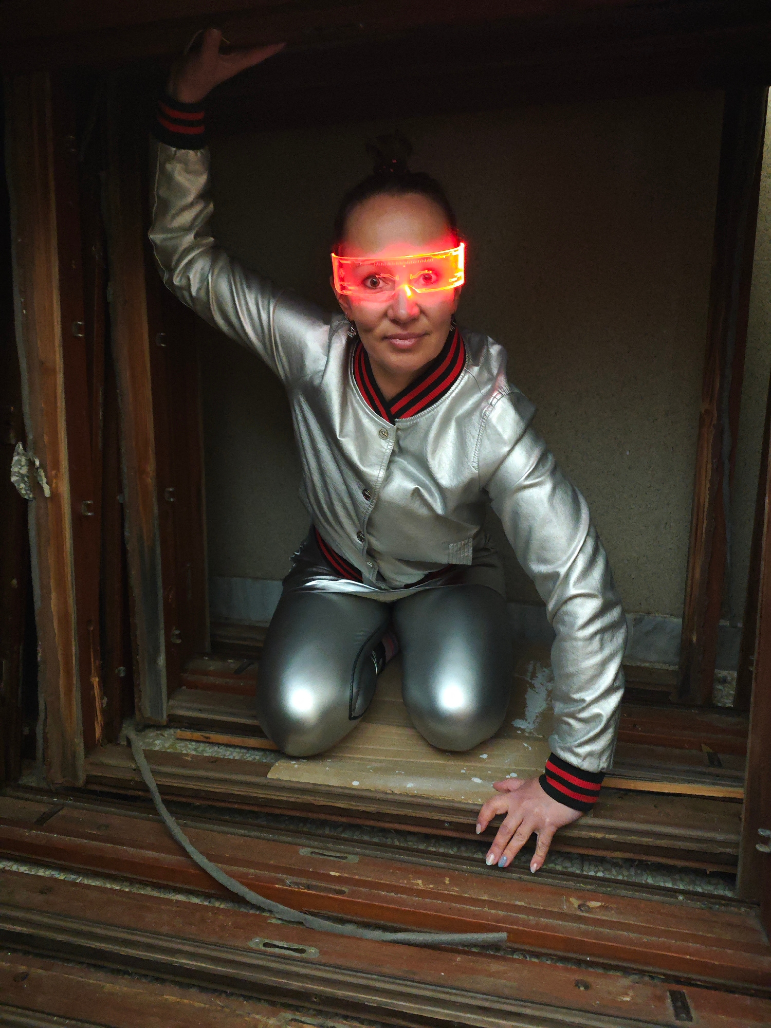 A woman is kneeling in a confined, weathered wooden structure, possibly an abandoned window frame, in what appears to be an indoor or enclosed space. The location is Марковский, Russia. She is wearing…read more