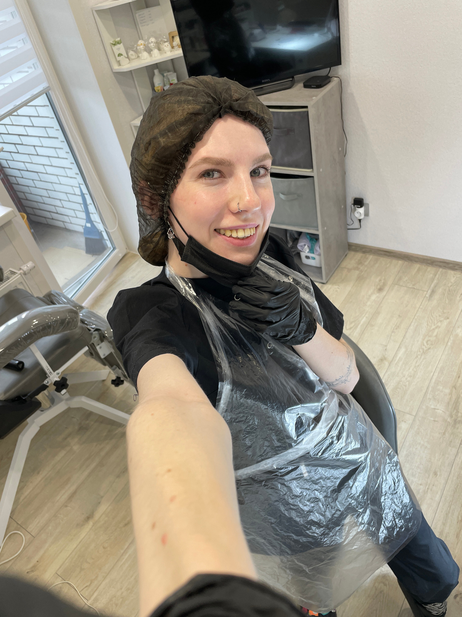 A selfie taken indoors shows a Caucasian woman with light skin, wearing a dark brown hairnet and a black face mask. She is smiling and looking up at the camera. The woman is also wearing a black t-shi…read more