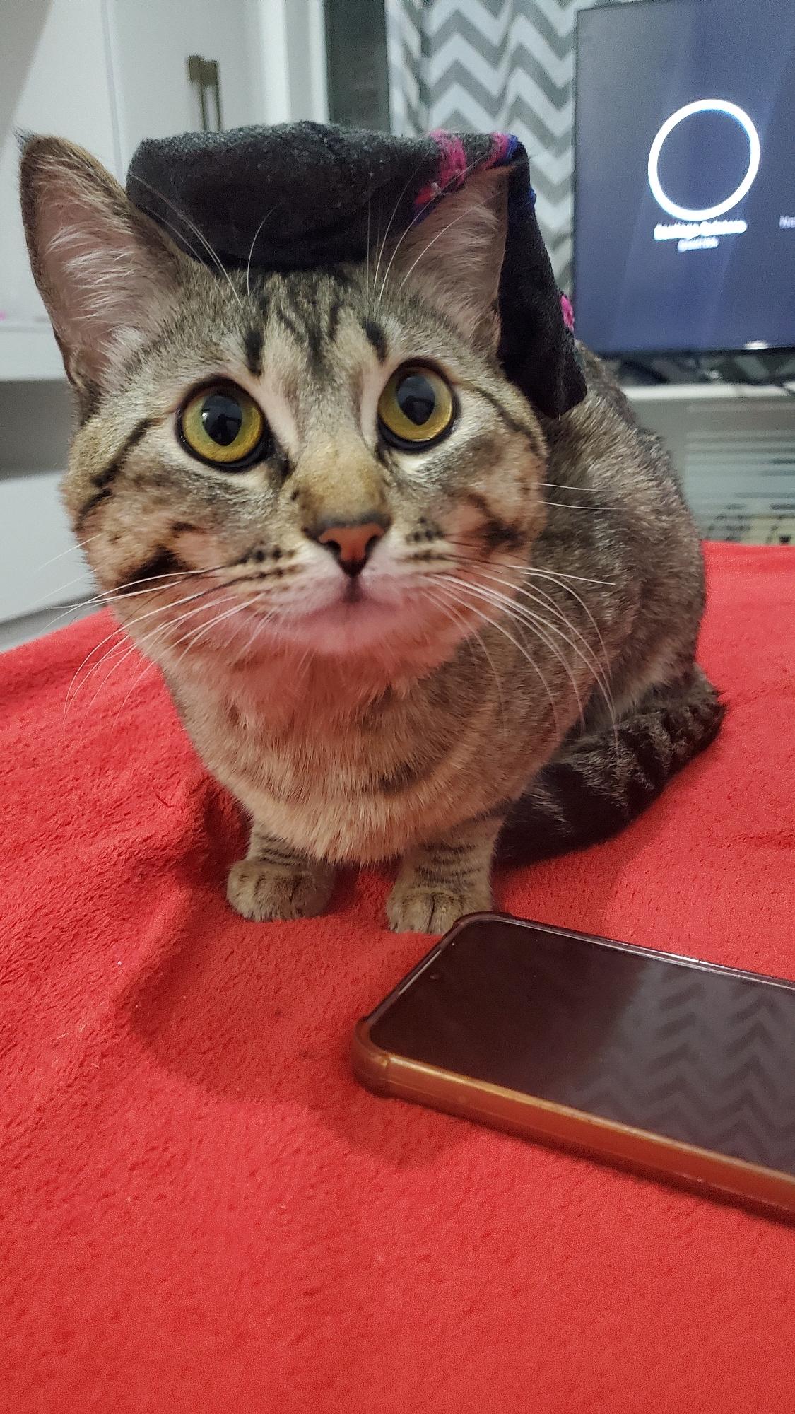 A domestic tabby cat lies on a red, textured blanket, facing the viewer. The cat is wearing a dark-colored hat. To the right of the cat is a smartphone. In the background, a television screen displays…read more