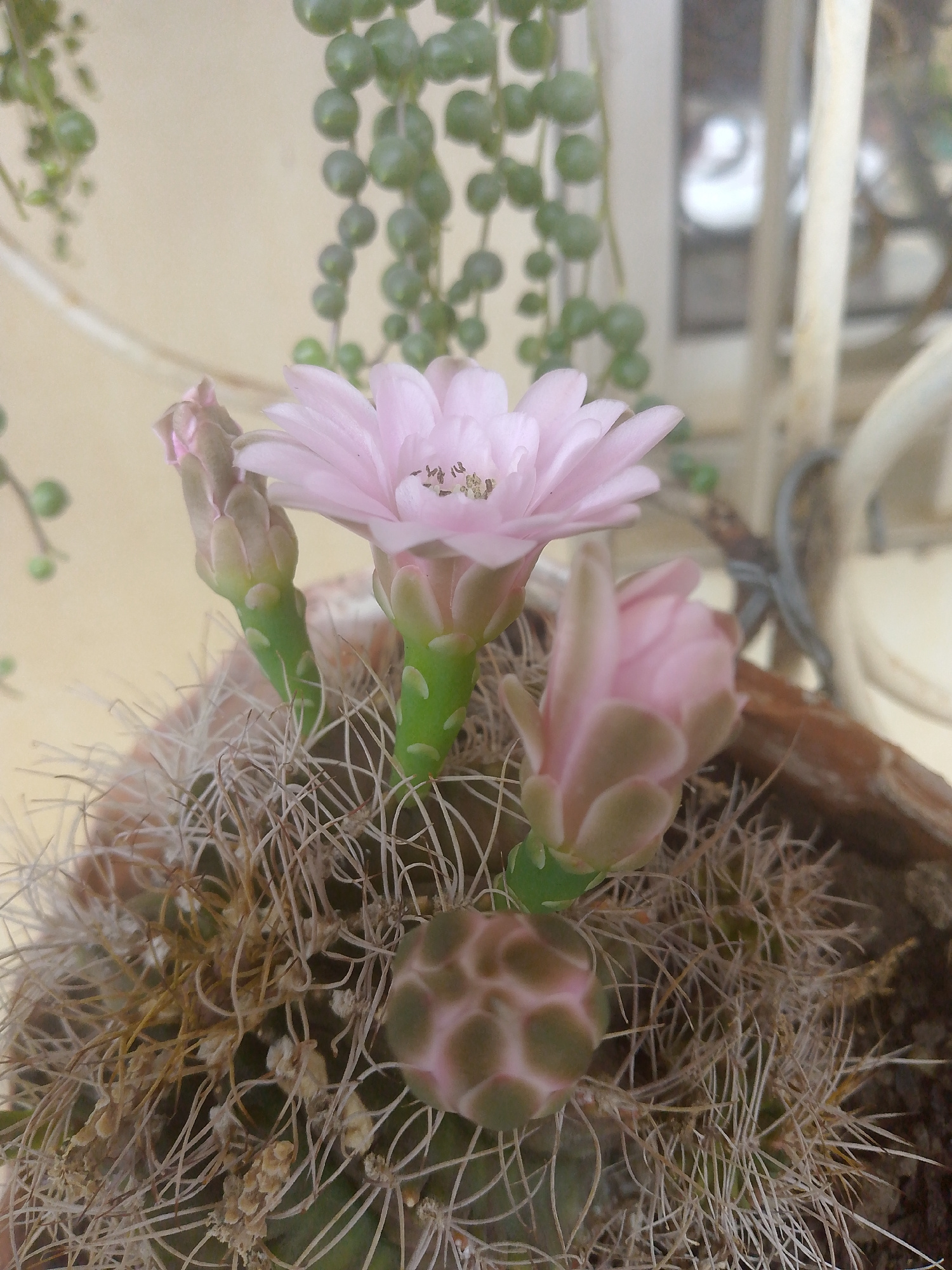 The image depicts a cactus in bloom, presumably indoors. Three pink cactus flowers are visible, one fully open and two in bud. The cactus itself is covered in fine, white spines. A segment of a succul…read more