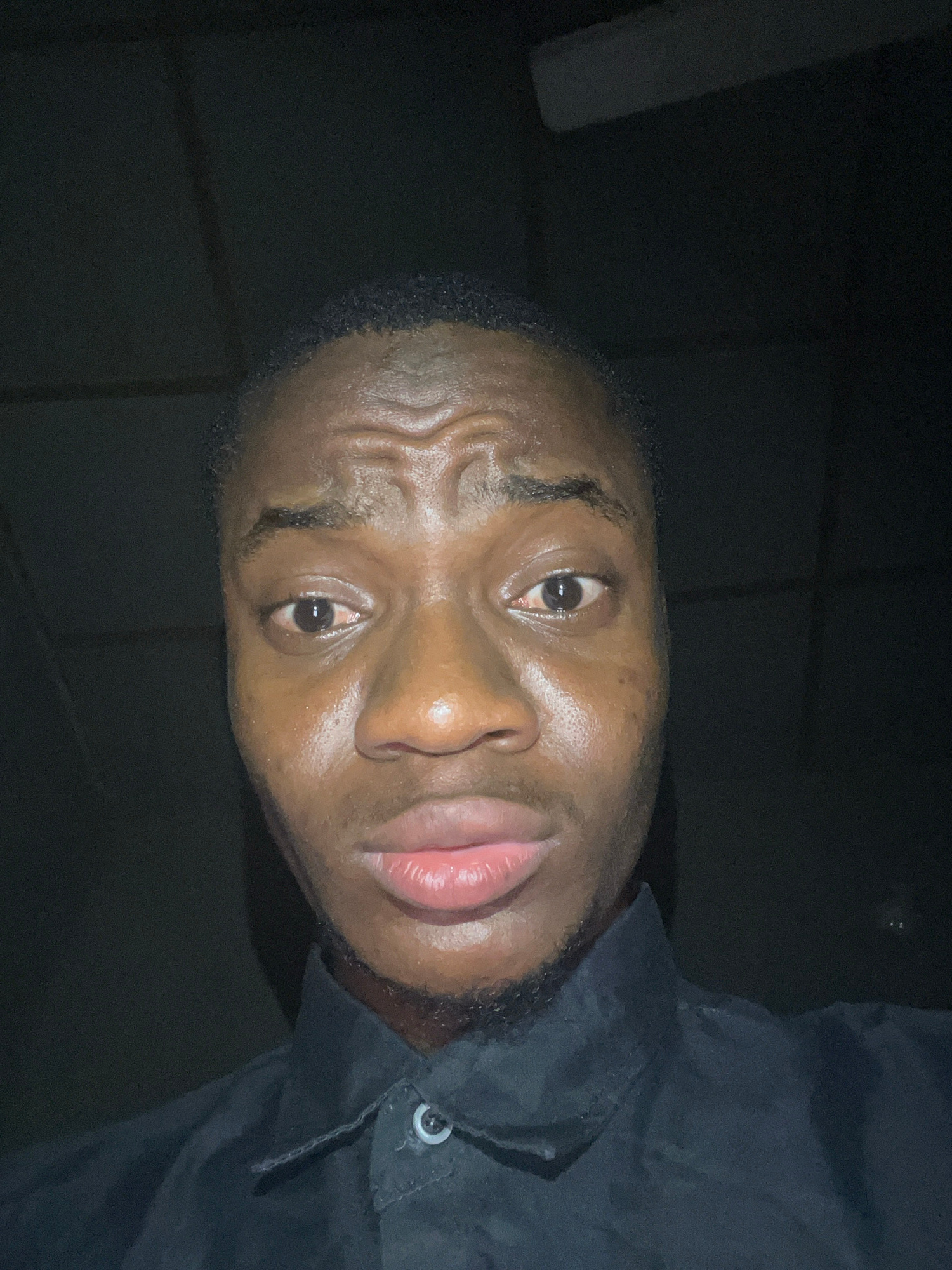 The image shows a close-up of a person's face and part of their upper body. The person has dark skin, with visible sweat or oil on the skin. The person is wearing a dark shirt with a button visible on…read more