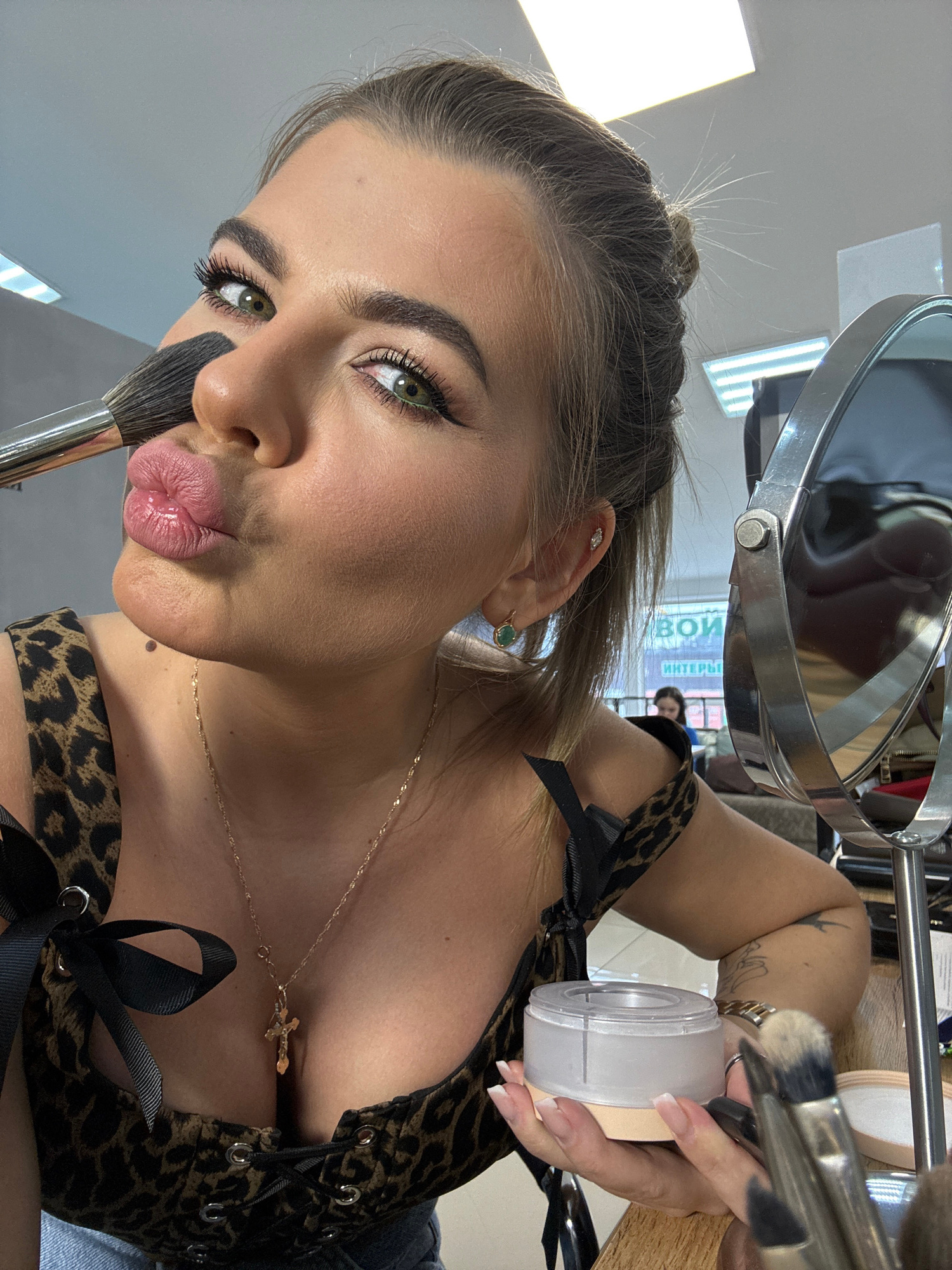 A woman poses for a close-up photograph while applying makeup. The image is taken from a low angle, looking up at the woman. She has light brown hair pulled back, green eyes with visible eyeliner, and…read more