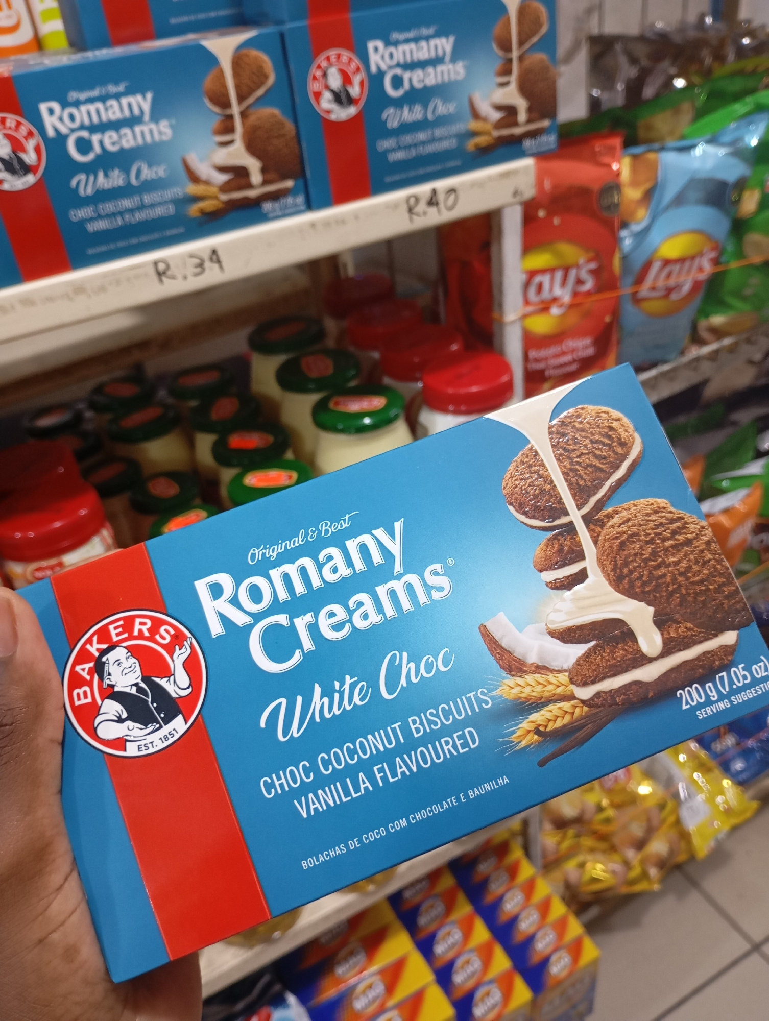 A person is holding a blue box of "Romany Creams White Choc" biscuits in a shop. Behind the box are shelves filled with various products, including jars with red and green lids, Lay's chips, and other…read more
