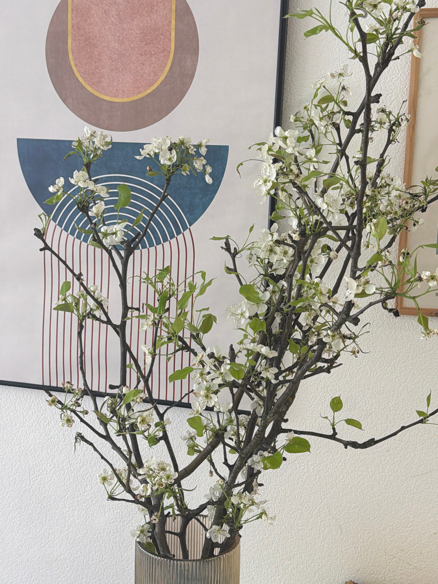 The image captures an indoor still life, primarily featuring a decorative arrangement of flowering branches against a white, textured wall. The main subject is a large, dark brown branch adorned with…read more