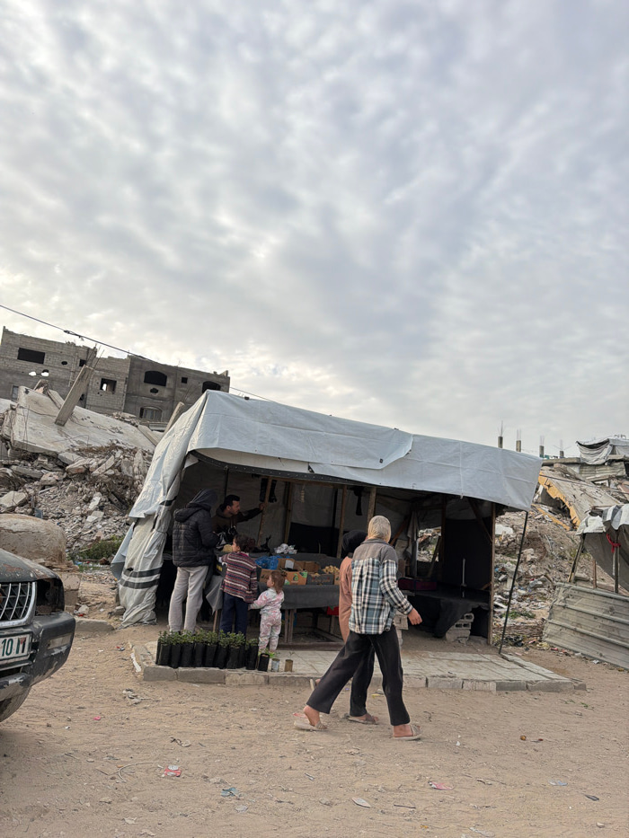 This image depicts an outdoor market scene in Jabalia, Palestinian Territory, set against a backdrop of extensive structural damage. In the foreground, a dark-colored vehicle, possibly a car, with a…read more