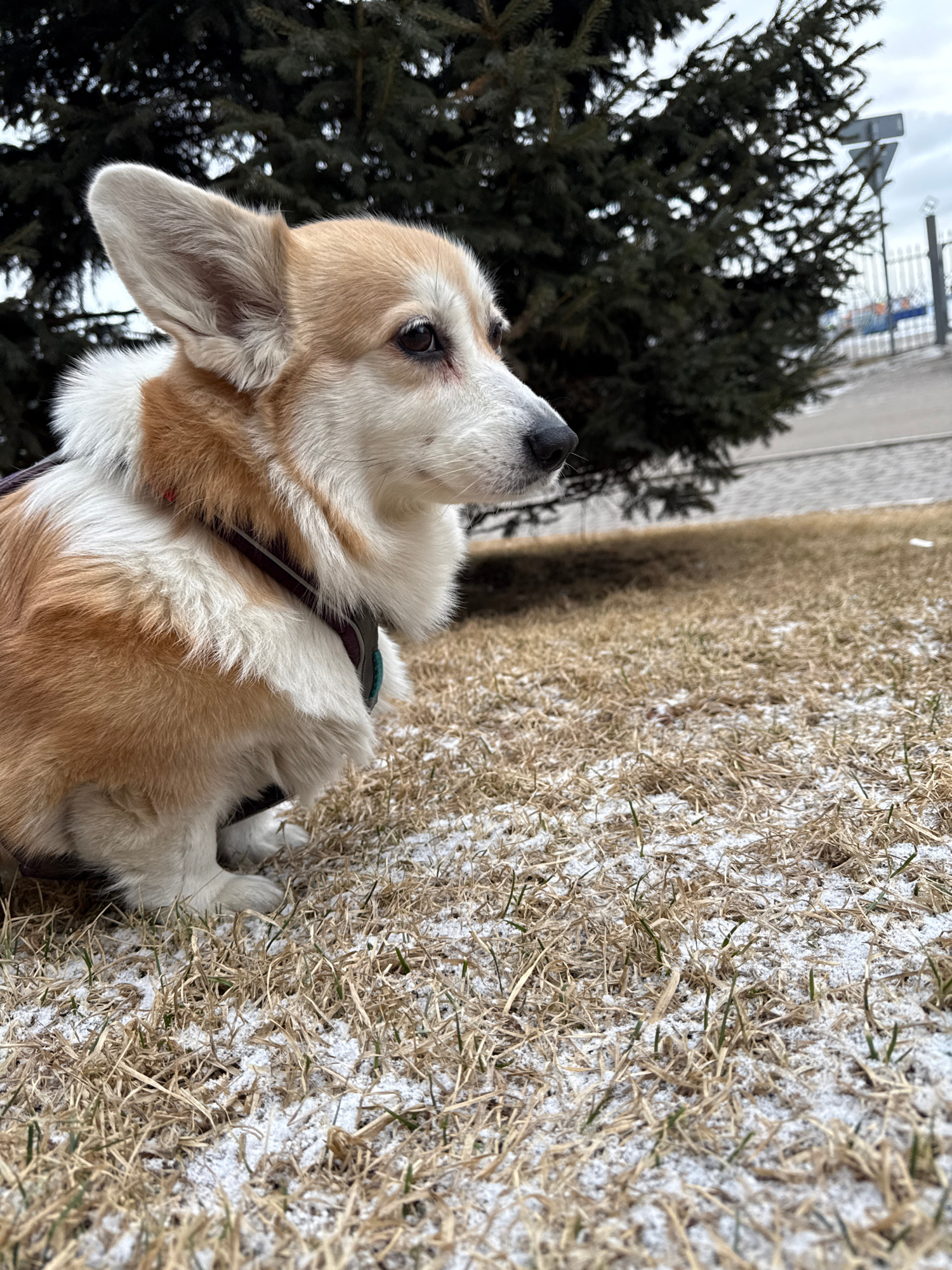 A tan and white corgi dog with a black collar is lying on a patch of dry grass lightly dusted with snow. The dog is positioned near the base of a conifer tree. In the background, a sidewalk, a partial…read more