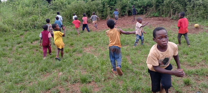 The scene depicts approximately thirteen children engaged in outdoor activity in Ngalula, Democratic Republic of the Congo. The children, appearing to be boys ranging in age from approximately 5 to 12…read more