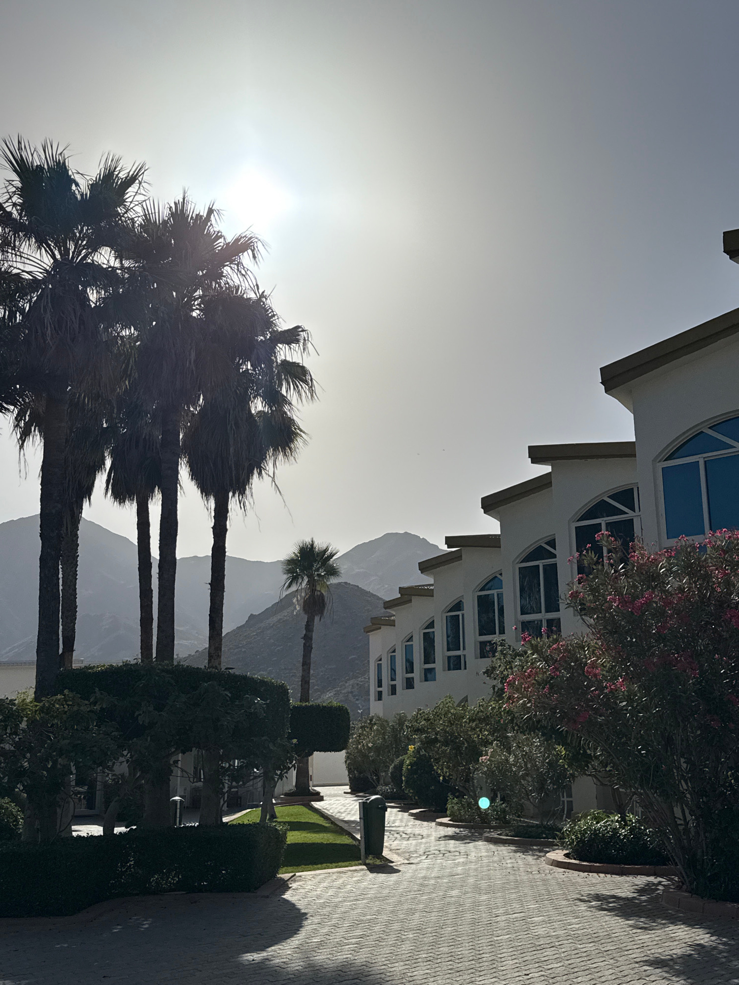 A slightly off-kilter, medium outdoor shot captures a building's architecture, vegetation, and a distant mountain range under a hazy sky. The building's facade, with its multiple arched windows and cr…read more