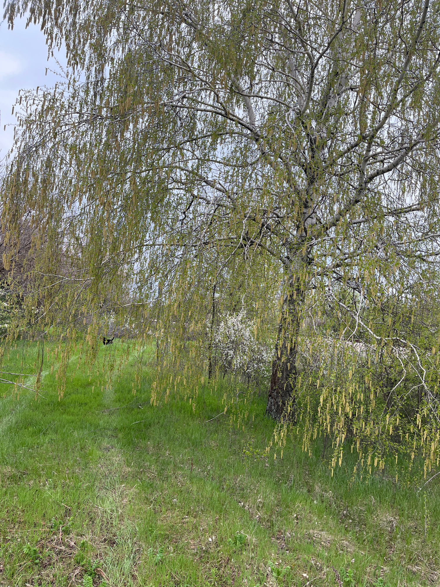 The image depicts a grassy field with trees in Levski, Bulgaria. The trees have white bark and branches with small green leaves and yellow catkins. The grass is green and lush, with some patches of br…read more