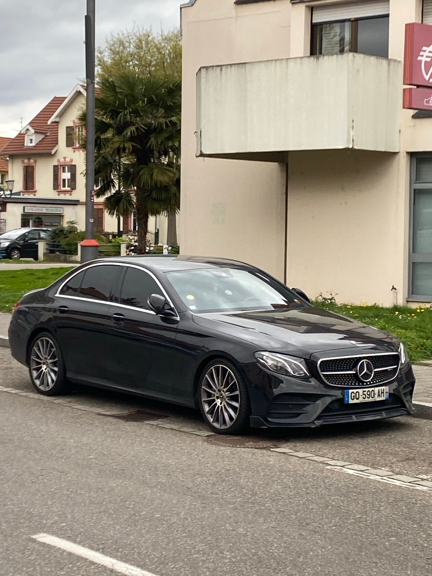 The image shows a black Mercedes-Benz sedan parked on a gray asphalt road in Bischheim, France. The car has a license plate reading "GQ-590-AH." A building is visible behind the car on the left, withβ¦read more